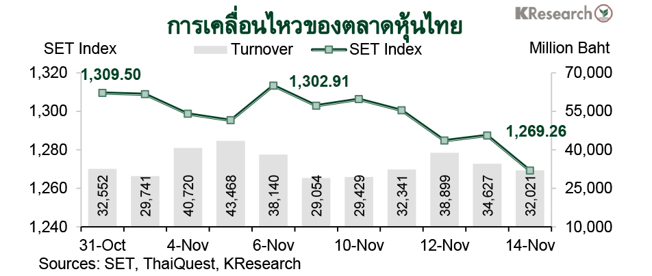 ดัชนีหุ้นไทยขยับขึ้นช่วงสั้น ๆ ในเวลาต่อมา ขานรับข่าวสถานการณ์ชัตดาวน์ในสหรัฐฯ (ที่ทำสถิติรอบนี้ยาวนานสุดในประวัติศาสตร์สหรัฐฯ) สิ้นสุดลง แต่กรอบการปรับขึ้นค่อนข้างจำกัดเนื่องจากยังคงเผชิญแรงขายต่อเนื่องในหุ้นกลุ่มค้าปลีก ดัชนีหุ้นไทยร่วงลงอีกครั้งในช่วงท้ายสัปดาห์ตามทิศทางตลาดหุ้นภูมิภาค หลังจากเจ้าหน้าที่เฟดหลายรายส่งสัญญาณไม่เร่งลดดอกเบี้ย ซึ่งทำให้การประชุมรอบถัดไปของเฟดยังคงมีความไม่แน่นอน นอกจากนี้ แรงขายหุ้นกลุ่มเทคโนโลยีตามทิศทางหุ้นเทคโนโลยีสหรัฐฯ ก็เป็นอีกปัจจัยที่กดดันตลาดหุ้นไทยด้วยเช่นกัน
