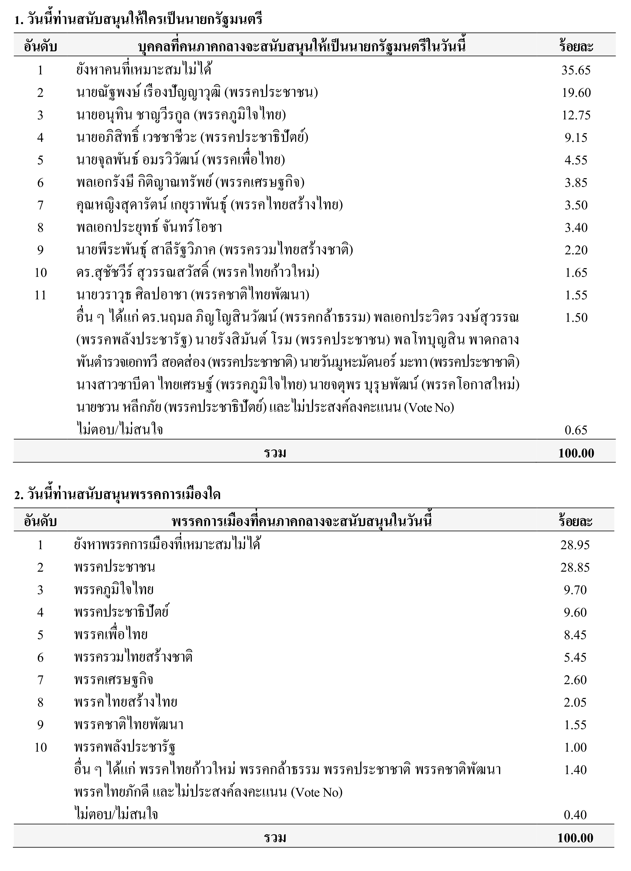 ท้ายที่สุดเมื่อถามถึงพรรคการเมืองที่คนภาคกลางจะสนับสนุนในวันนี้ พบว่า อันดับ 1 ร้อยละ 28.95 ระบุว่า ยังหาพรรคการเมืองที่เหมาะสมไม่ได้ อันดับ 2 ร้อยละ 28.85 ระบุว่าเป็น พรรคประชาชน อันดับ 3 ร้อยละ 9.70 ระบุว่าเป็น พรรคภูมิใจไทย อันดับ 4 ร้อยละ 9.60 ระบุว่าเป็น พรรคประชาธิปัตย์ อันดับ 5 ร้อยละ 8.45 ระบุว่าเป็น พรรคเพื่อไทย อันดับ 6 ร้อยละ 5.45 ระบุว่าเป็น พรรครวมไทยสร้างชาติ อันดับ 7 ร้อยละ 2.60 ระบุว่าเป็น พรรคเศรษฐกิจ อันดับ 8 ร้อยละ 2.05 ระบุว่าเป็น พรรคไทยสร้างไทย อันดับ 9 ร้อยละ 1.55 ระบุว่าเป็น พรรคชาติไทยพัฒนา อันดับ 10 ร้อยละ 1.00 ระบุว่าเป็น พรรคพลังประชารัฐ ร้อยละ 1.40 ระบุอื่น ๆ ได้แก่ พรรคไทยก้าวใหม่ พรรคกล้าธรรม พรรคประชาชาติ พรรคชาติพัฒนา พรรคไทยภักดี และไม่ประสงค์ลงคะแนน (Vote No) และร้อยละ 0.40 ระบุว่า ไม่ตอบ/ไม่สนใจ