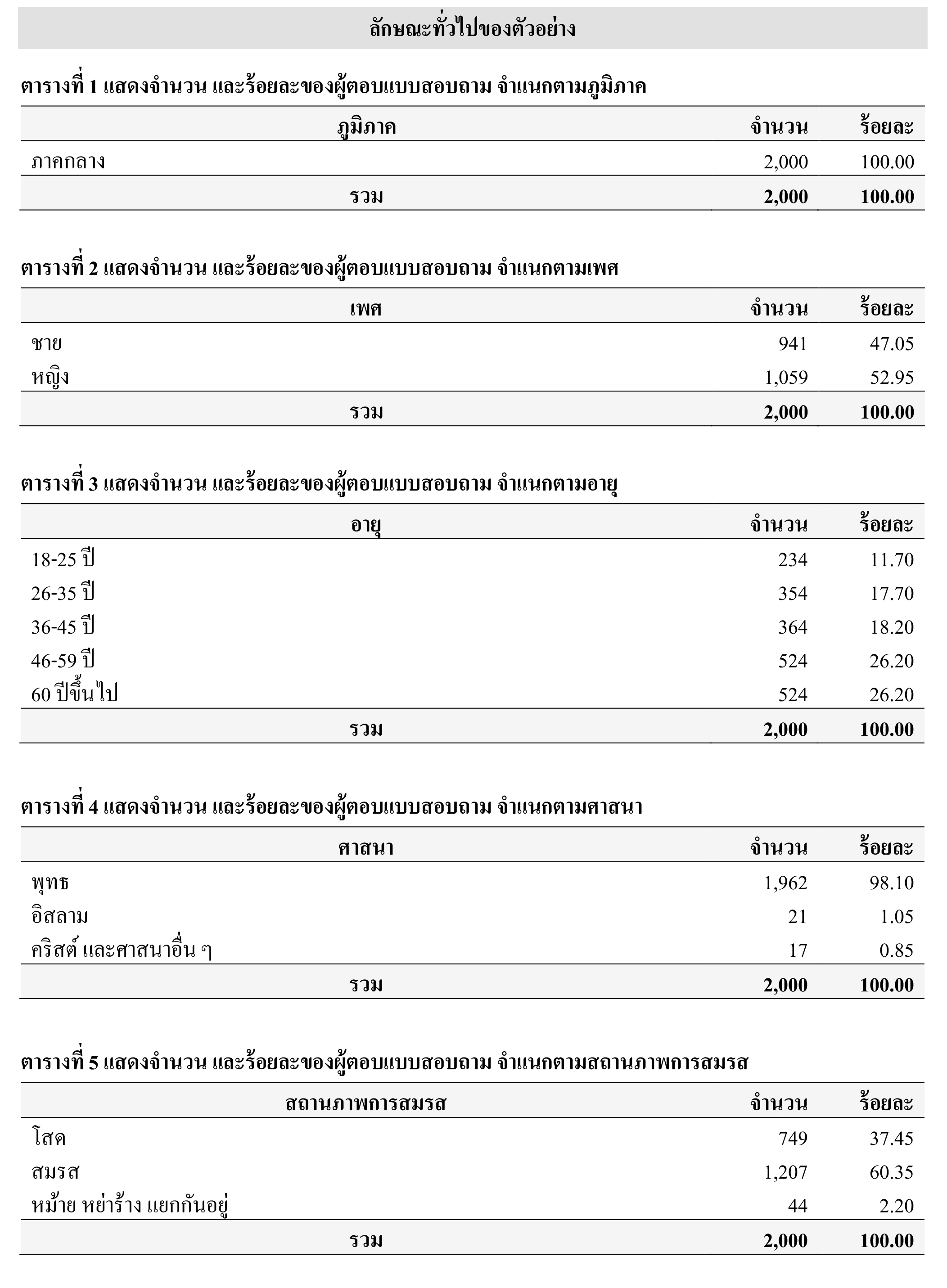 เมื่อพิจารณาลักษณะทั่วไปของตัวอย่าง พบว่า ตัวอย่างทั้งหมดมีภูมิลำเนาตามทะเบียนบ้านอยู่ภาคกลาง โดยตัวอย่าง ร้อยละ 47.05 เป็นเพศชาย และร้อยละ 52.95 เป็นเพศหญิง