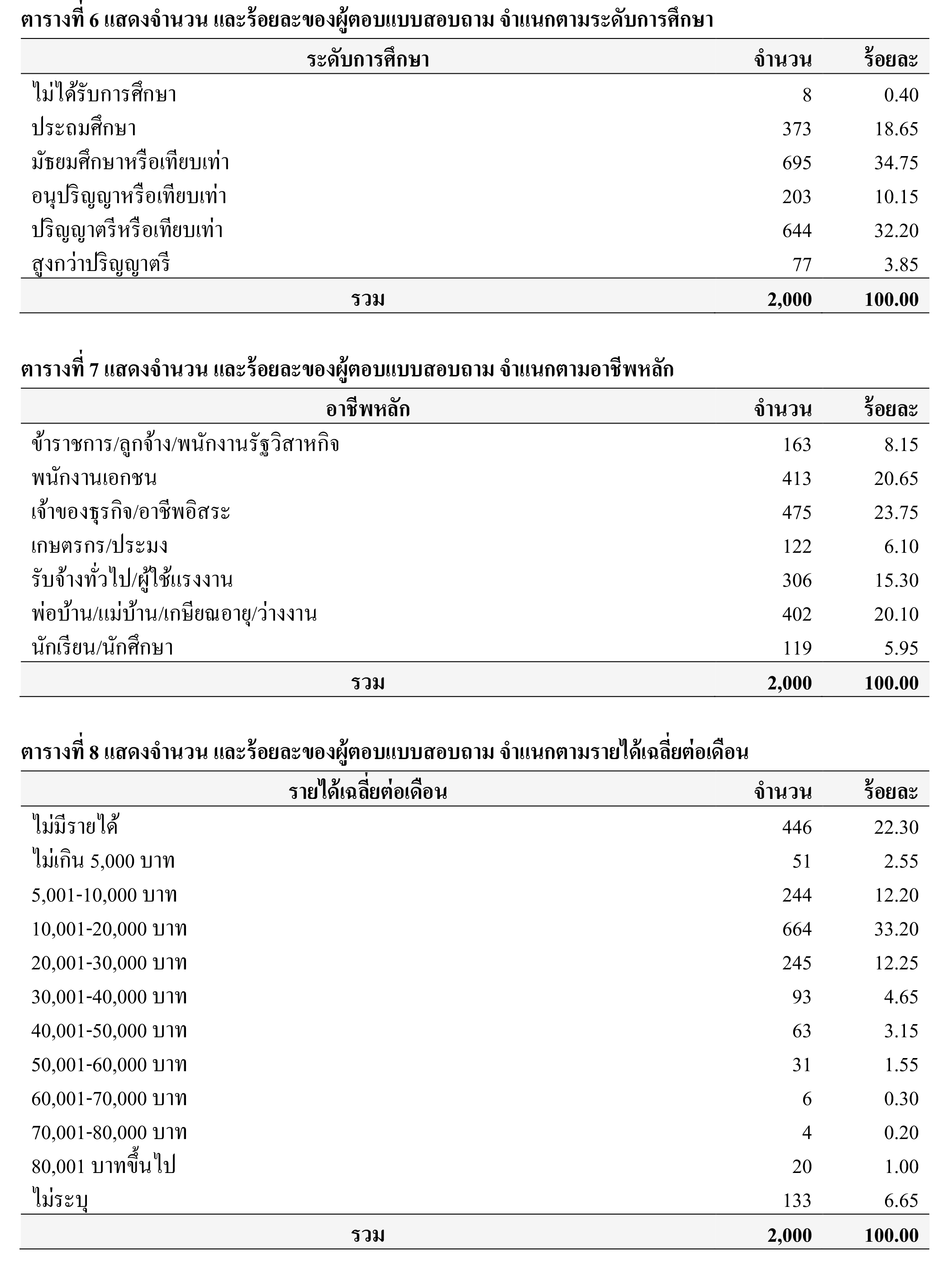 ตัวอย่าง ร้อยละ 8.15 ประกอบอาชีพข้าราชการ/ลูกจ้าง/พนักงานรัฐวิสาหกิจ ร้อยละ 20.65 ประกอบอาชีพพนักงานเอกชน ร้อยละ 23.75 ประกอบอาชีพเจ้าของธุรกิจ/อาชีพอิสระ ร้อยละ 6.10 ประกอบอาชีพเกษตรกร/ประมง ร้อยละ 15.30 ประกอบอาชีพรับจ้างทั่วไป/ผู้ใช้แรงงาน ร้อยละ 20.10 เป็นพ่อบ้าน/แม่บ้าน/เกษียณอายุ/ว่างงาน และร้อยละ 5.95 เป็นนักเรียน/นักศึกษา