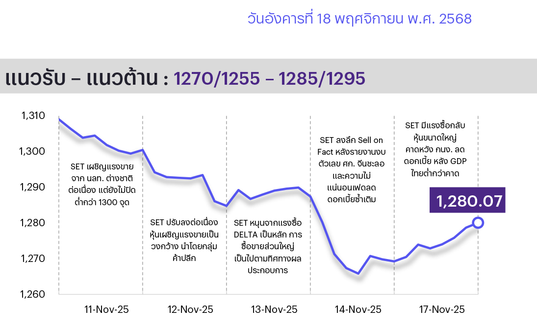 คาดตลาดแกว่งตัวไซด์เวย์/พักตัว ติดตามความสัมพันธ์ระหว่างไทย-กัมพูชาที่อาจส่งผลทางจิตวิทยา แม้ว่าผลกระทบต่อเศรษฐกิจไทยและกำไรบริษัทจดทะเบียนรวมยังจำกัด ในขณะที่โอกาสในการลดดอกเบี้ยของเฟดใน ธ.ค. ลดลงเหลือเพียง 43% หนุนให้เงินทุนไหลเข้าตลาดเกิดใหม่และไทยน้อยลงได้ในช่วงถัดไป ทางเทคนิคตลาดรีบาวด์หลังทดสอบ 1265 แล้ว หากยังไม่สามารถยืนเหนือ 1285/1295 ได้ให้ระวังว่าจะเป็นเพียงรีบาวด์สั้น การลงมีแนวรับที่ 1270/1255