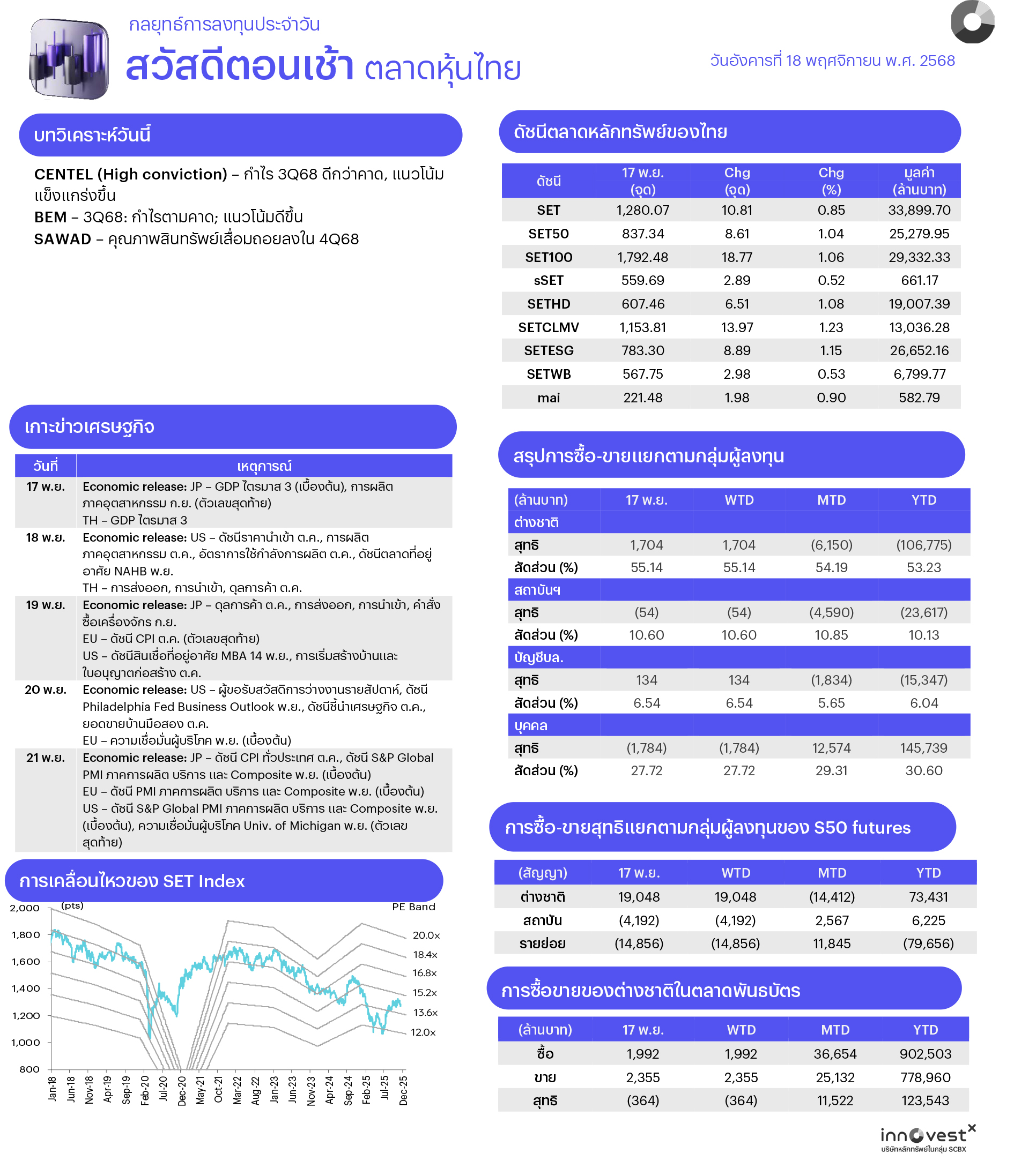 ช่วงสั้นมอง SET มีโอกาสพักตัวหรือแกว่งตัวลง หลังตลาดเริ่มขาดปัจจัยบวกใหม่ โดยทางเทคนิคหลังดัชนีหลุดต่ำกว่าแนวรับสำคัญ 1285 ทำให้มีโอกาสแกว่งลงไปที่บริเวณ 1265/1240 ส่วนปัจจัยในประเทศที่ต้องติดตาม ได้แก่ ความสัมพันธ์ไทย-กัมพูชาซึ่งอาจกระทบต่อจิตวิทยาการลงทุนในระยะสั้น แม้คาดจะมีผลกระทบจำกัดต่อผลประกอบการ บจ. ไทยโดยรวม รวมทั้งการประชุม ครม. คาดจะมีการพิจารณามาตรการแก้หนี้เสียรายย่อย, รถไฟฟ้าสายสีม่วง-สีแดง 40 บาทตลอดสาย และเงินช่วยเหลือผู้ประสบภัยน้ำท่วม ขณะที่ปัจจัยต่างประเทศที่ต้องติดตาม ได้แก่ FOMC Minutes, ตัวเลขเศรษฐกิจสหรัฐที่สำคัญทั้งภาคแรงงาน NFPs และภาคเงินเฟ้อ PCE CPI หากหน่วยงานราชการกลับมาเปิด ดังนั้นกลยุทธ์ลงทุนจึงแนะนำให้ “Selective Buy”