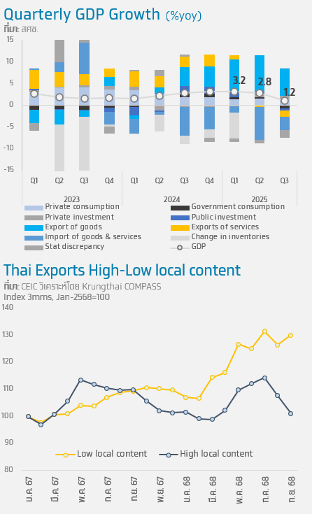 • Krungthai COMPASS ประเมินว่าเศรษฐกิจไตรมาสที่ 3 ปี 2568 ขยายตัวต่ำกว่าที่คาดที่ 1.2%YoY และยังเป็นการหดตัวจากไตรมาสก่อนที่ -0.6%QoQSA สะท้อนเศรษฐกิจที่ขาดแรงขับเคลื่อน แม้การส่งออกสินค้าของไทยในปีนี้จนถึงไตรมาสที่ 3 จะขยายตัวสูง 13.9%YoY (custom basis) แต่ไม่ได้ส่งผลดีต่อภาคเศรษฐกิจอื่นเท่าที่ควร เนื่องจากเป็นการส่งออกที่มี local content ต่ำ โดยหากไม่รวมกลุ่มที่มี local content ต่ำ สินค้าที่มีสัดส่วน foreign content จากจีนเพิ่มขึ้น และทองคำ การส่งออกไทยจะขยายตัวได้เพียง 5.6%YoY
