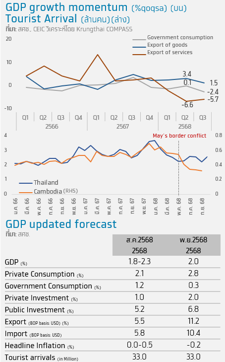 • Krungthai COMPASS ยังคาดว่าเศรษฐกิจไทยในปี 2568 จะขยายตัวได้ที่ 2.0%YoY โดยในไตรมาสสุดท้ายของปีอาจมีแรงส่งเพิ่มเติมจากมาตรการกระตุ้นเศรษฐกิจของภาครัฐ ท่ามกลางความเสี่ยงจากผลกระทบของข้อตกลงการค้ากับสหรัฐฯ ที่กลับมามีความไม่แน่นอนหลังถูกยกเป็นส่วนหนึ่งในข้อเจรจาประเด็นความขัดแย้งไทย-กัมพูชา
