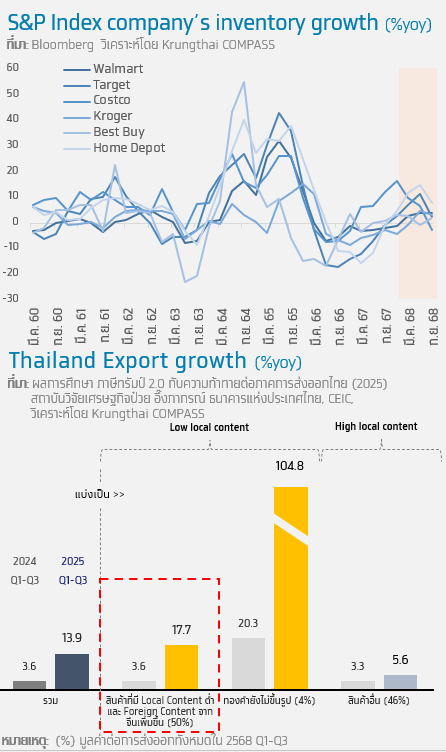 • นอกจากนี้ แนวโน้มการส่งออกในระยะข้างหน้าอาจไม่ได้หดตัวรุนแรง หลังการเร่งนำเข้าสินค้าของสหรัฐฯ ตลอดช่วงปี 2568 สะท้อนจากสินค้าคงคลังของธุรกิจค้าส่งค้าปลีกรายใหญ่ในสหรัฐฯ ที่ยังไม่เห็นสัญญาณการ build-up stock ที่สูงผิดปกติ