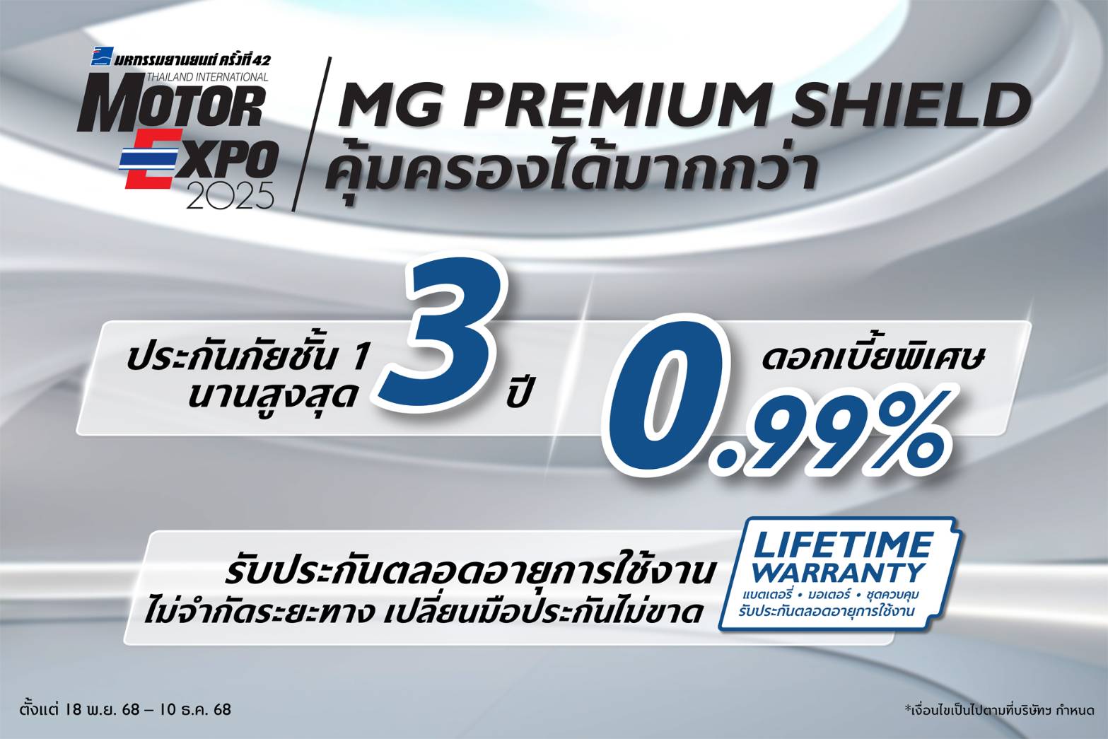 MG SHIELD ประกันภัยชั้นหนึ่ง พร้อม พ.ร.บ. นาน 3 ปี หรือ ดอกเบี้ยพิเศษ 0.99% นาน 48 เดือน MG SHIELD ประกันภัยชั้น 1 พร้อม พ.ร.บ. นาน 1 ปี