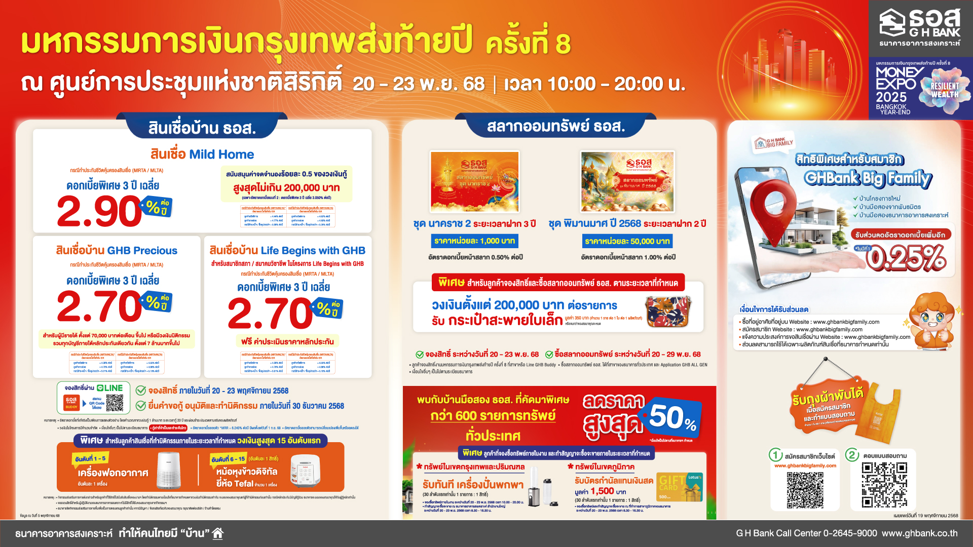 กรณีกู้ 1 ล้านบาท ผ่อนชำระเงินงวดเริ่มต้นเพียงเดือนละ 3,300 บาท และพิเศษ ! สำหรับอัตราดอกเบี้ยแบบที่ 2 ธนาคารสนับสนุนค่าจดจำนองร้อยละ 0.5 ของวงเงินกู้ สูงสุดไม่เกิน 2 แสนบาท สำหรับกลุ่มลูกค้า Refinance in อัตราดอกเบี้ยคงที่ 2 ปีแรก เริ่มต้น 3.05% ต่อปี ปีที่ 3 เท่ากับ MRR-3.195% ต่อปี อัตราดอกเบี้ยเฉลี่ย 3 ปีแรกเพียง 3.05% ปีที่ 4 – 6 เท่ากับ MRR – 2.345% ต่อปี และปีที่ 7 จนถึงตลอดอายุสัญญา กรณีลูกค้าสวัสดิการ เท่ากับ MRR-1.00% ต่อปี ลูกค้ารายย่อย เท่ากับ MRR-0.50% ต่อปี และซื้ออุปกรณ์ ฯ / ชำระหนี้ ฯ เท่ากับ MRR กรณีกู้ 1 ล้านบาท ผ่อนชำระเงินงวดเริ่มต้นเพียงเดือนละ 3,400 บาท ผู้ที่สนใจสามารถจองสิทธิ์ภายในงานผ่าน Line GHB Buddy ระหว่างวันที่ 20 – 23 พฤศจิกายน 2568 ยื่นคำขอกู้ อนุมัติและทำนิติกรรมภายในวันที่ 30 ธันวาคม 2568 พิเศษ !! ลูกค้าที่ทำนิติกรรม ภายในระยะเวลาที่กำหนด วงเงินสูงสุด 5 อันดับแรก รับเครื่องฟอกอากาศ อันดับละ 1 เครื่อง และอันดับที่ 6 – 15 รับหม้อหุงข้าวดิจิทัล อันดับละ 1 เครื่อง (เงื่อนไขเป็นไปตามที่ธนาคารกำหนด)