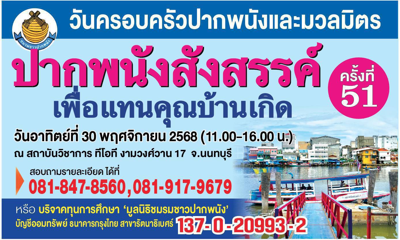 มูลนิธิชมรมชาวปากพนัง จัดงานวันครอบครัวชาวปากพนังและมวลมิตร "ปากพนังสังสรรค์" ครั้งที่ 51 ประจำปี 2568 เพื่อระดมทุนการศึกษาให้กับนักเรียน ในวันอาทิตย์ที่ 30 พฤศจิกายน 2568 ที่สถาบันวิชาการทีโอที งามวงศ์วาน 17 นนทบุรี เวลา 11.00-16.00 น.