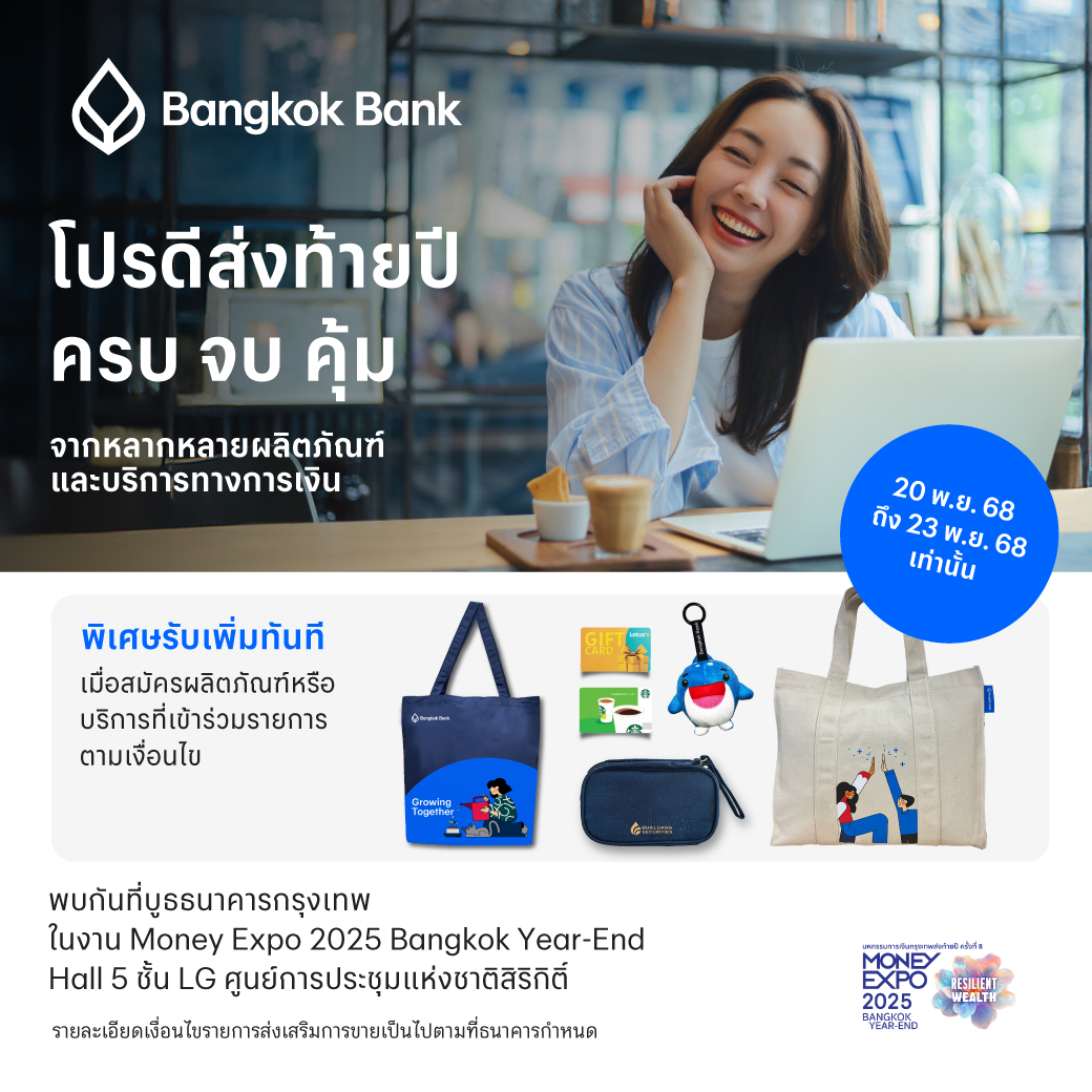 ผู้สนใจสามารถเยี่ยมชมบูธธนาคารกรุงเทพ พร้อมรับคำปรึกษาทางการเงินจากผู้เชี่ยวชาญและโปรโมชันพิเศษ ภายในงานมหกรรมการเงินส่งท้ายปี ครั้งที่ 8 (Money Expo Year End 2025) ระหว่างวันที่ 20–23 พฤศจิกายน 2568 ณ Hall 5 ชั้น LG ศูนย์การประชุมแห่งชาติสิริกิติ์