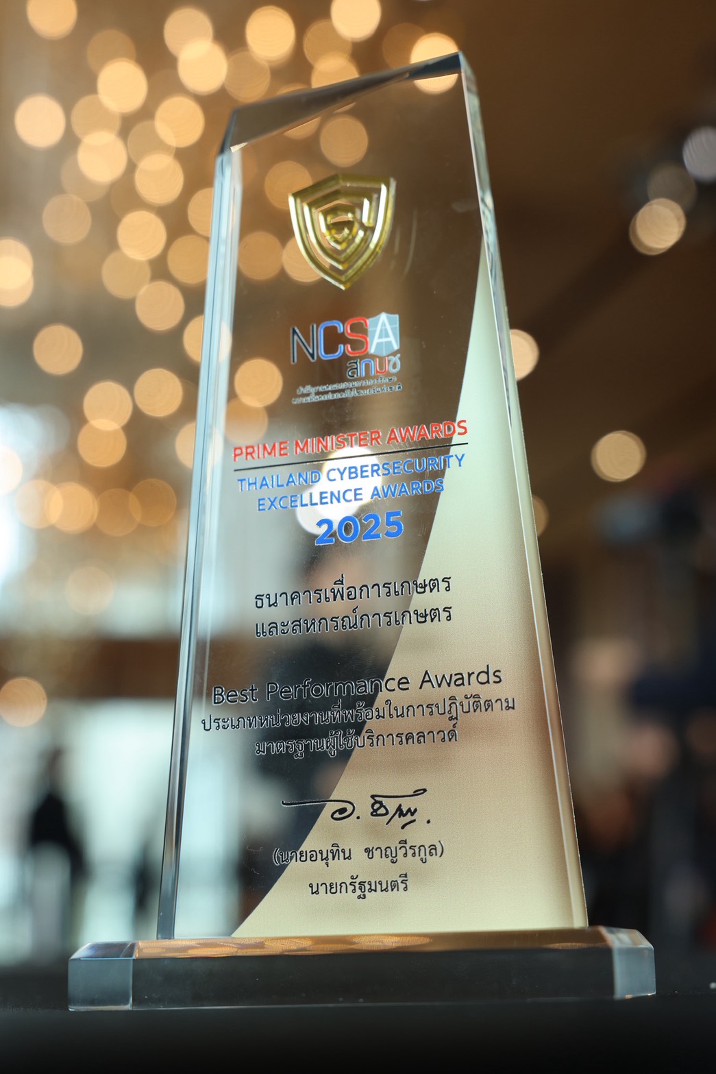 มอบโล่รางวัลเกียรติยศ Best Performance Award ในงาน Prime Minister Awards: Thailand Cybersecurity Excellence Awards 2025 ที่จัดขึ้นโดยสำนักงานคณะกรรมการการรักษาความมั่นคงปลอดภัยไซเบอร์แห่งชาติ (สกมช.) ซึ่งรางวัลดังกล่าวสะท้อนถึงการเป็นหน่วยงานรัฐที่มีผลงานโดดเด่นระดับชาติในด้านการรักษาความมั่นคงปลอดภัยไซเบอร์ โดย ธ.ก.ส. จะมุ่งมั่นพัฒนาและเสริมสร้างระบบรักษาความมั่นคงปลอดภัยไซเบอร์ให้มีประสิทธิภาพและปลอดภัยยิ่งขึ้นต่อไป โดยมีนายพิพัฒน์ รัชกิจประการ รองนายกรัฐมนตรีและรัฐมนตรีว่าการกระทรวงคมนาคมเป็นประธานในพิธีมอบรางวัล ณ ห้อง Diamond Ballroom 1-2 ชั้น 4 โรงแรมแกรนด์ ริชมอนด์ สไตลิช คอนเวนชั่น จังหวัดนนทบุรี เมื่อวันที่ 20 พฤศจิกายน 2568