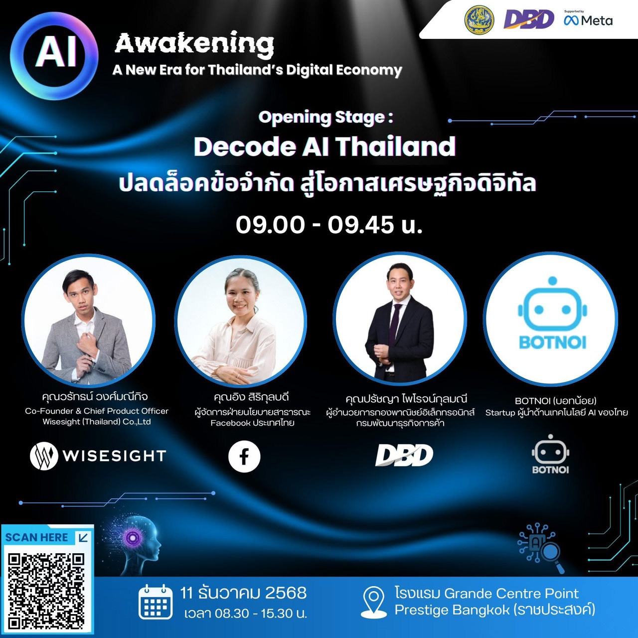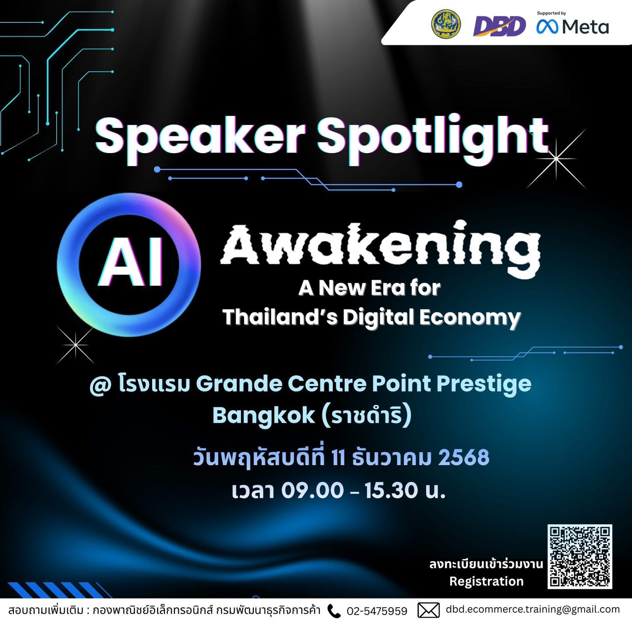 กรมพัฒนาธุรกิจการค้า และ Facebook ประเทศไทย ได้ร่วมกันจัดงาน “AI Awakening : A New Era for Thailand’s Digital Economy” ในวันพฤหัสบดีที่ 11 ธันวาคม 2568 ณ โรงแรมแกรนด์ เซนเตอร์พอยต์ เพรสทีจ กรุงเทพมหานคร โดยได้รับเกียรติจาก รัฐมนตรีว่าการกระทรวงพาณิชย์ (นางศุภจี สุธรรมพันธุ์) และผู้บริหารระดับภูมิภาคของ บริษัท เฟซบุ๊ก (ประเทศไทย) จำกัด ร่วมเสวนา หัวข้อ “Thailand’s Vision for Smart Commerce : Innovation, Inclusion, and Internationalization” เพื่อสร้างแรงบันดาลใจในการพัฒนาธุรกิจ พร้อมทั้ง Workshop แบบเข้มข้น และอัปเดตเทรนด์การตลาดออนไลน์ อาทิ (1) Workshop “Meta AI & Ads Solutions for SME Growth” โดยคุณมัณฑิตา จินดา ผู้ก่อตั้ง Digital Tips Academy (2) การเสวนา “Decode AI Thailand : ปลดล็อกข้อจำกัด สู่โอกาสเศรษฐกิจดิจิทัล” โดย Startup ด้านเทคโนโลยีชั้นนำของไทย และ (3) การบรรยายหัวข้อ “Creative Reels on Your Radar” จากทีมผู้เชี่ยวชาญของ Meta ประเทศไทย