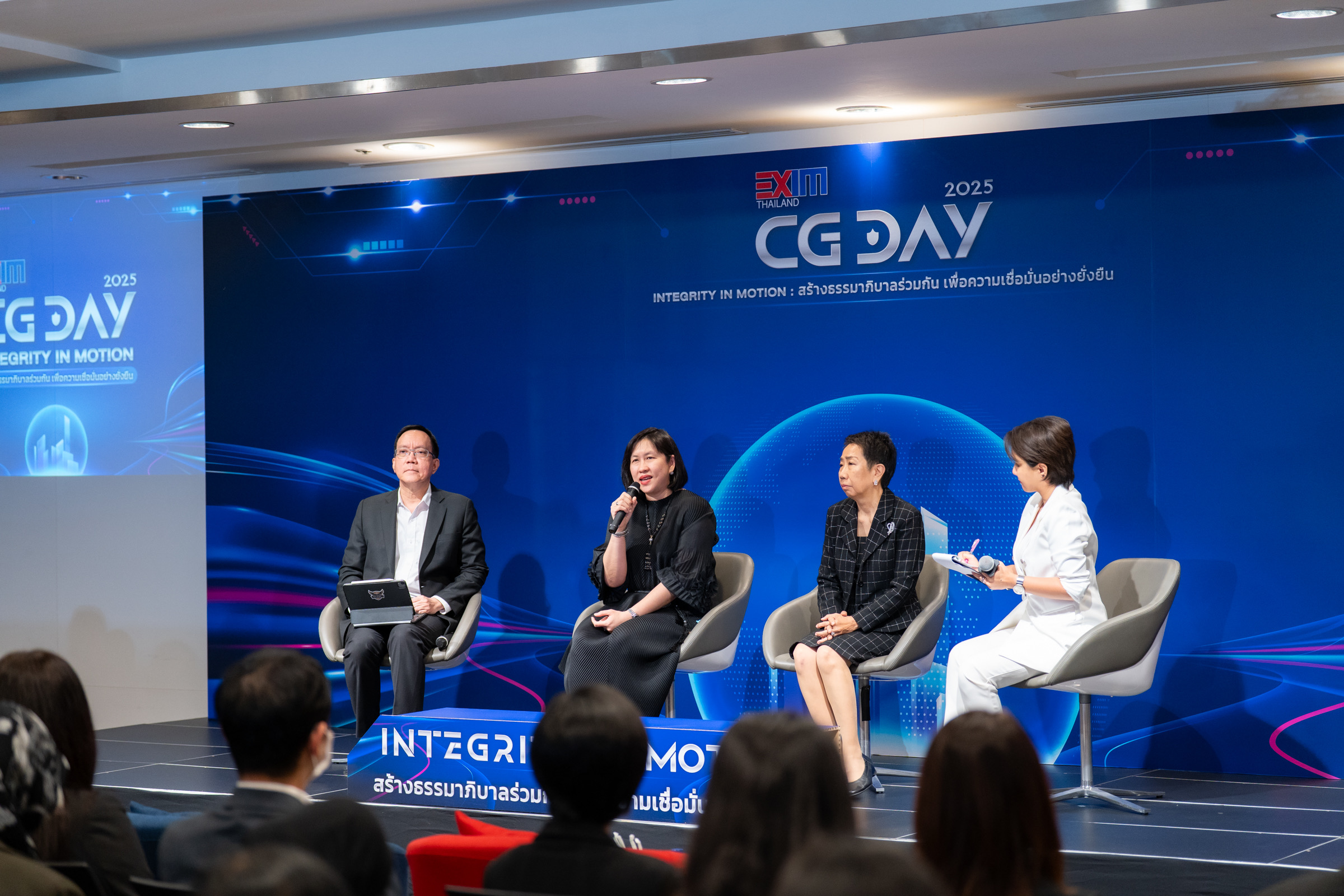 ภายในงาน คณะกรรมการ CG&SD ประกอบด้วย นางสาวรุจิกร แสงจันทร์ ดร.วโรทัย โกศลพิศิษฐ์กุล และนางสาวภควดี จรรยาเพศ ได้ร่วมเสวนาหัวข้อ “ทำอย่างไรให้การขับเคลื่อนธรรมาภิบาลในองค์กรเกิดขึ้นอย่างยั่งยืน” แลกเปลี่ยนมุมมองและวิสัยทัศน์ด้านธรรมาภิบาล เพื่อร่วมกันผลักดันให้เกิดวัฒนธรรมองค์กรที่โปร่งใส ตรวจสอบได้ และสามารถเติบโตอย่างยั่งยืนในระยะยาว นอกจากนี้ มีการจัดนิทรรศการนำเสนอการประยุกต์ใช้หลักการกำกับดูแลกิจการที่ดีและมาตรการต่อต้านการทุจริตคอร์รัปชันในกระบวนการทำงานของ EXIM BANK รวมถึงมีการจัดบูทแสดงสินค้าของผู้ประกอบการที่มีธรรมาภิบาล การจัดงานนี้สะท้อนถึงความมุ่งมั่นของธนาคารในการเดินหน้าเสริมสร้างระบบกำกับดูแลกิจการที่เข้มแข็ง เพื่อสร้างความเชื่อมั่นแก่ผู้มีส่วนได้ส่วนเสีย และยกระดับมาตรฐานธรรมาภิบาลขององค์กรให้ก้าวทันความเปลี่ยนแปลงในยุคใหม่อย่างต่อเนื่อง
