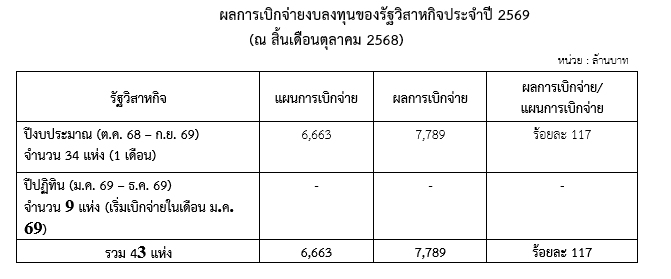 นางสาวปิยวรรณ ล่ามกิจจา ที่ปรึกษาด้านพัฒนารัฐวิสาหกิจ กล่าวเพิ่มเติมว่า ณ เดือนตุลาคม 2568 รัฐวิสาหกิจปีงบประมาณได้เริ่มการเบิกจ่ายงบลงทุนเป็นเดือนแรกของปีบัญชี 2569 โดยมีผลการเบิกจ่ายจำนวน 7,789 ล้านบาท คิดเป็นร้อยละ 117 ของแผนการเบิกจ่าย ทั้งนี้ รัฐวิสาหกิจปีงบประมาณที่เบิกจ่ายสูงกว่าร้อยละ 95 ของแผนการเบิกจ่ายและมีมูลค่าสูงสุด 3 อันดับ ได้แก่ รฟท. รฟม. และการประปาส่วนภูมิภาค