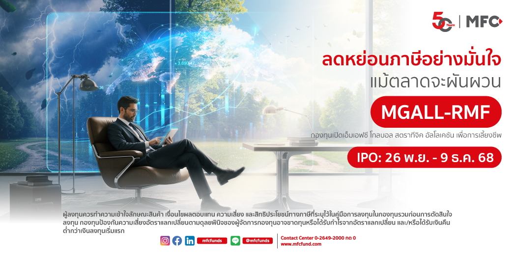 สำหรับกองทุน MGALL-RMF เป็นกองทุนรวมผสมต่างประเทศ ประเภท Feeder Fund เพื่อการเลี้ยงชีพมีระดับความเสี่ยง 5 เปิดเสนอขายครั้งแรก (IPO) วันที่ 26 พฤศจิกายน – 9 ธันวาคม 2568 เงินลงทุนขั้นต่ำครั้งแรก 1,000 บาท ครั้งต่อไป 500 บาท กองทุนไม่กำหนดอายุโครงการ สามารถซื้อและขายคืนหน่วยลงทุนได้ทุกวันทำการทั้งนี้ ผู้ลงทุนควรทำความเข้าใจลักษณะสินค้า เงื่อนไข ผลตอบแทน ความเสี่ยงและสิทธิประโยชน์ทางภาษีที่ระบุไว้ ในคู่มือการลงทุนในกองทุนรวม ก่อนการตัดสินใจลงทุน กองทุนป้องกันความเสี่ยงอัตราแลกเปลี่ยนตามดุลยพินิจของผู้จัดการกองทุนอาจขาดทุนหรือได้รับกำไรจากอัตราแลกเปลี่ยน และ/หรือได้รับเงินคืนต่ำกว่าเงินลงทุนเริ่มแรก ผู้ที่สนใจสอบถามข้อมูลและขอรับหนังสือชี้ชวนได้ที่ บลจ.เอ็มเอฟซี จำกัด (มหาชน) และตัวแทนสนับสนุนการขาย หรือ โทรศัพท์ 0-2649-2000 ติดต่อฝ่ายวางแผนการลงทุน กด 2 หรือ Contact Center กด 0 สาขาแจ้งวัฒนะ โทร. 0-2835-3055-57 สาขาปิ่นเกล้า โทร. 0-2014-3150-2 สาขาขอนแก่น โทร. 043-204-014-16 สาขาเชียงใหม่ โทร.0-5321-8480-82 สาขาระยอง โทร. 033-100-340 สาขาหาดใหญ่ โทร.074-232-324-25 หรือที่ www.mfcfund.com