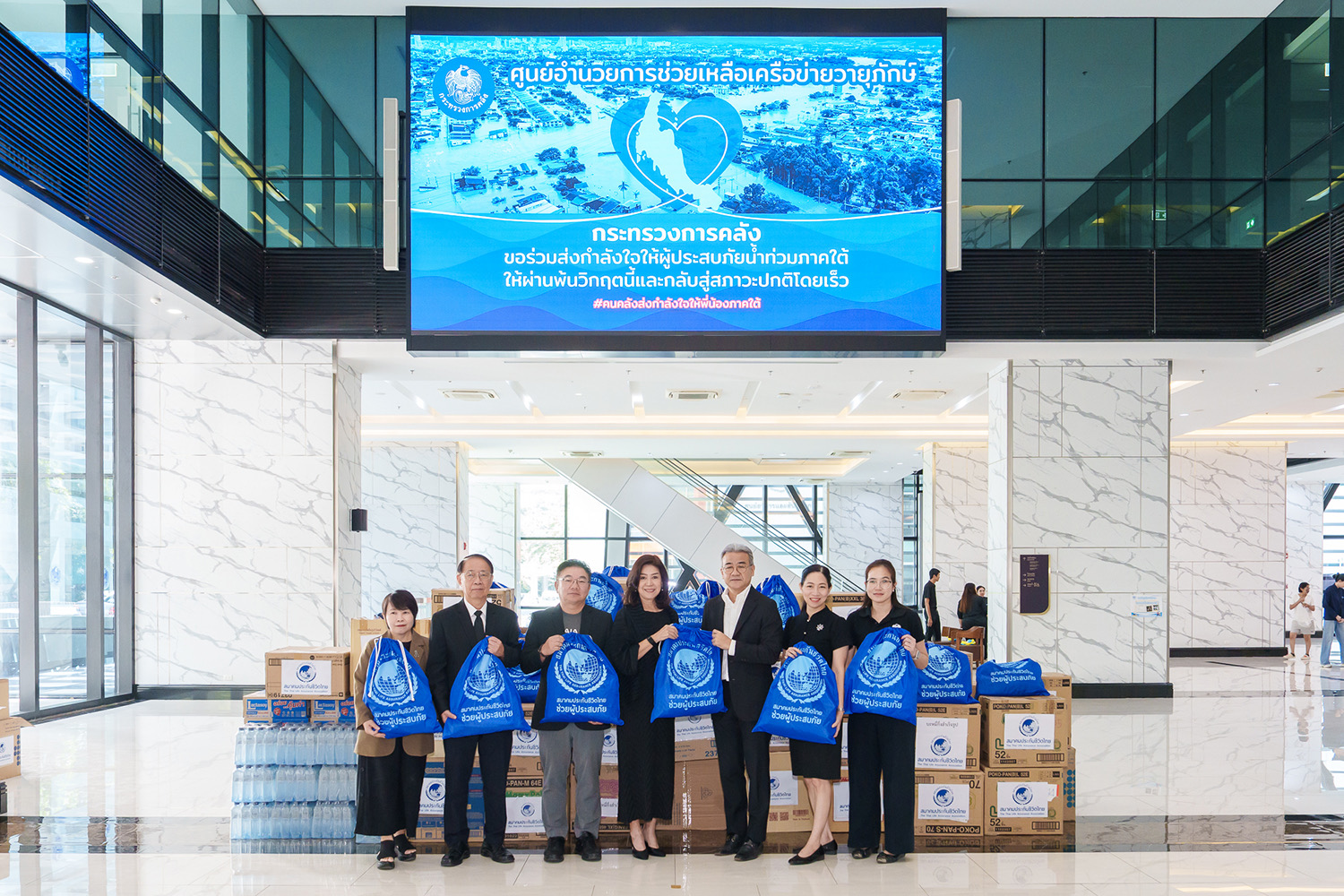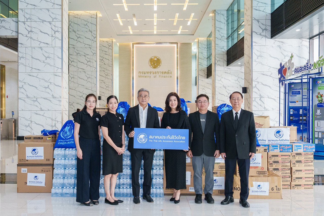 สมาคมประกันชีวิตไทย นำโดย นางนุสรา (อัสสกุล) บัญญัติปิยพจน์ นายกสมาคมประกันชีวิตไทย พร้อมคณะผู้บริหารสมาคม ร่วมมอบสิ่งของจำเป็น อุปโภคบริโภค และชุดยังชีพ เพื่อช่วยเหลือผู้ประสบอุทกภัยในพื้นที่ภาคใต้ ผ่านศูนย์วายุภักษ์รวมใจเพื่อประชาชน กระทรวงการคลัง ในการนี้ ได้รับเกียรติจาก นายอรรถพล อรรถวรเดช รองปลัดกระทรวงการคลัง เป็นผู้แทนรับมอบ ณ ชั้น 1 อาคาร 150 ปี กระทรวงการคลัง ถนนพระราม 6 เขตพญาไท กรุงเทพมหานคร เมื่อวันที่ 28 พฤศจิกายน 2568