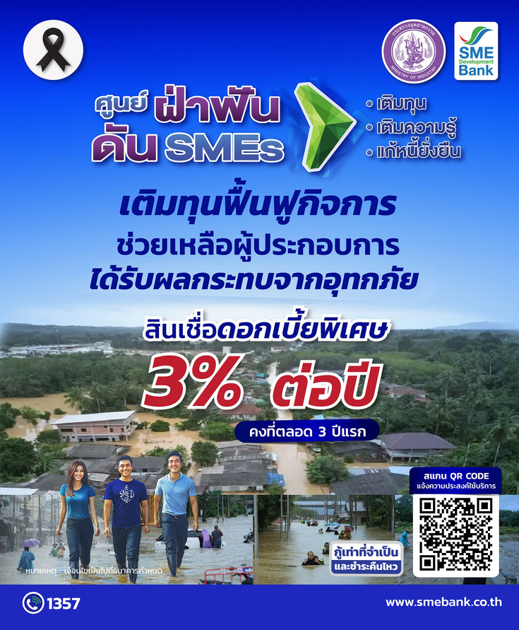 SME D Bank จับมือ สมาพันธ์ SME ไทย ช่วยเหลือผู้ประกอบการในพื้นที่ภาคใต้ประสบอุทกภัย เข้าถึงแหล่งทุนอัตราดอกเบี้ยพิเศษ 3%ต่อปี คงที่ตลอด 3 ปีแรก ผ่านกลไก "ศูนย์ฝ่าฟัน ดัน SMEs" ช่วยให้มีเงินทุนนำไปเสริมสภาพคล่อง ลงทุน ปรับปรุง สามารถฟื้นฟูกิจการกลับมาเดินหน้าตามปกติได้โดยเร็ว