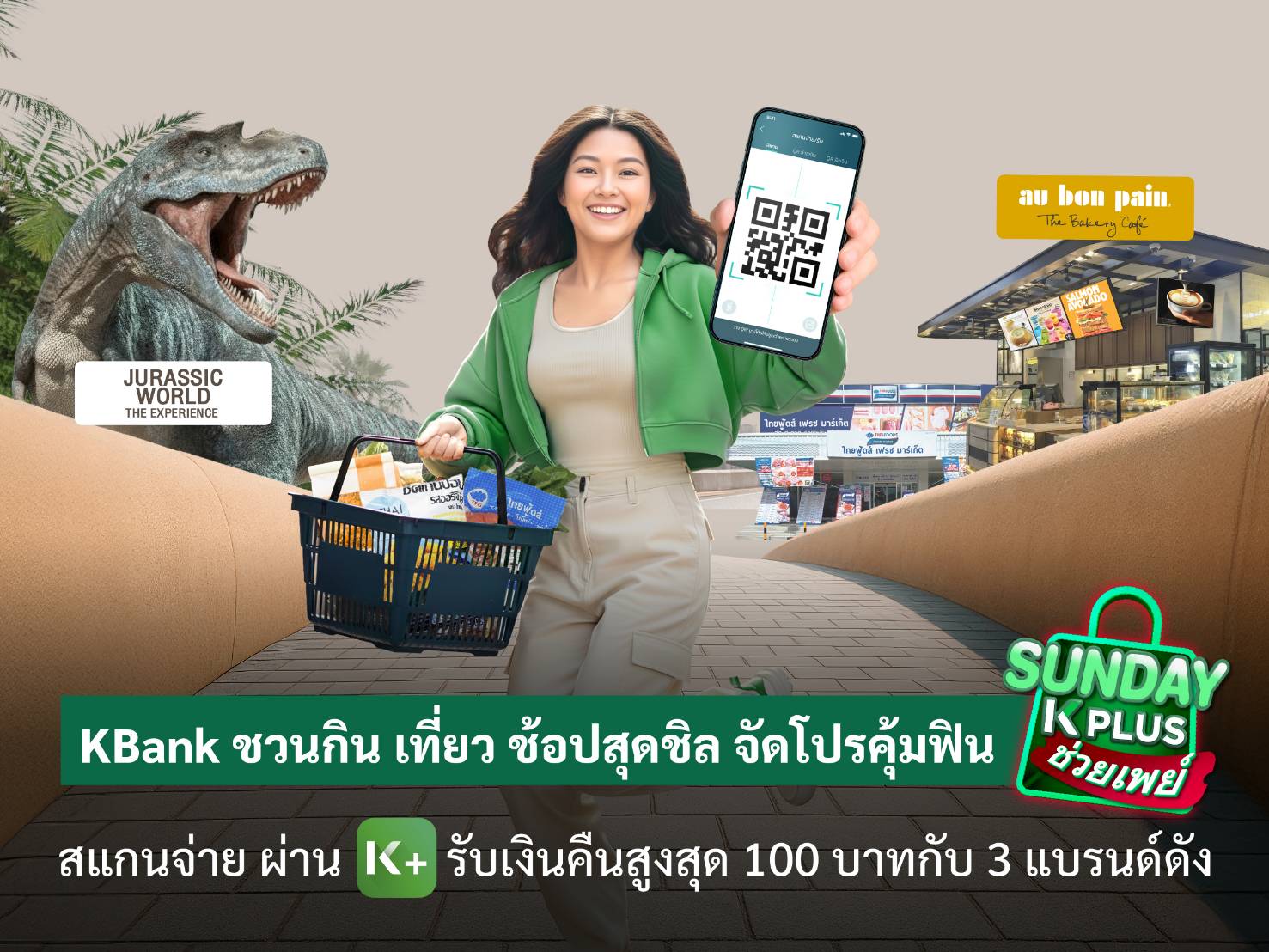 ธนาคารกสิกรไทยมอบความคุ้มสุดฟินให้ลูกค้าใช้ K PLUS กิน เที่ยว ช้อป สุดชิลทุกวันอาทิตย์ กับแคมเปญ “Sunday K PLUS ช่วยเพย์” สแกนจ่าย QR ผ่าน K PLUS ที่ 3 ร้านค้าแบรนด์ดัง Au Bon Pain Jurassic World: The Experience และ Thaifoods fresh market รับเงินคืนสูงสุด 100 บาท ตั้งแต่ วันนี้ – 11 มกราคม 2569