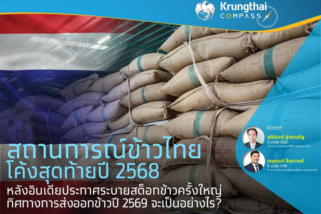 Krungthai COMPASS คาดว่า การระบายสต็อกข้าวของอินเดียจะทำให้ราคาและปริมาณส่งออกข้าวไทยลดลง โดยในปี 2568 คาดว่าราคาส่งออกข้าวขาว 5% เฉลี่ยของไทยจะอยู่ที่ราว 405 เหรียญสหรัฐฯ/ตัน สอดคล้องกับการประเมินของ World Bank ที่คาดว่าจะอยู่ที่ราว 406 เหรียญสหรัฐฯ/ตัน ส่วนในปี 2569 ประมานการโดยใช้สมการถดถอย (Regression Model) กำหนดให้อัตราการเปลี่ยนแปลงปริมาณการค้าข้าวโลก เป็นตัวแปรต้น (ปริมาณการค้าข้าวโลกเป็นปัจจัยที่สะท้อนอุปทานข้าวโลกได้ระดับหนึ่ง เพราะเมื่อปริมาณการค้าข้าวโลกเพิ่มขึ้น อาจหมายความว่ามีอุปทานในประเทศเหลือมากจนต้องระบายส่งออก) พบว่า ความยืดหยุ่นของอัตราการเปลี่ยนแปลงของราคาข้าวไทยต่อการประเมินดังกล่าวสอดคล้องกับงานศึกษาของ Durand-Morat & Wailes (2018) จาก University of Arkansas ที่พบว่า หากปริมาณการค้าข้าวในตลาดโลกเพิ่มขึ้น 1% จะทำให้ราคาข้าวเฉลี่ยในตลาดโลกลดลงประมาณ 0.6–0.8% เช่นเดียวกับผลการศึกษาของ Gilbert (2010) ที่ชี้ว่าความผันผวนของราคาข้าวส่วนใหญ่เกิดจากการเปลี่ยนแปลงของปริมาณการค้าข้าวรวมในตลาดโลกและนโยบายการค้าของประเทศผู้ส่งออกรายใหญ่