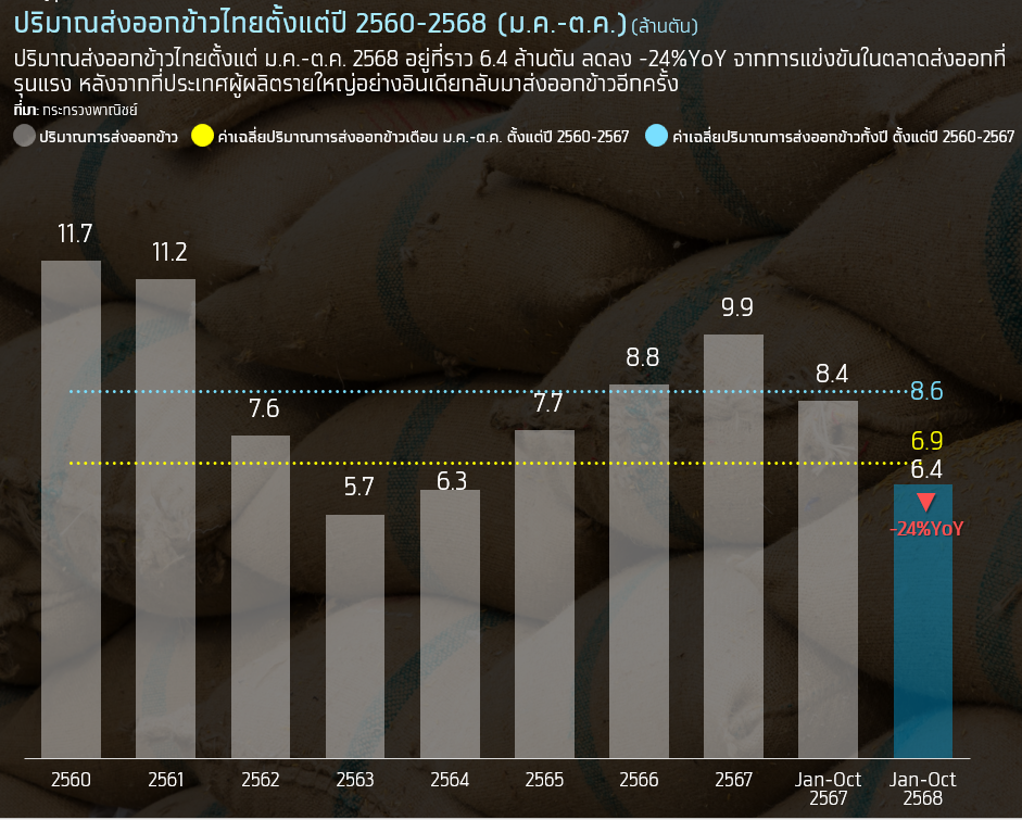 ราคาส่งออกข้าวขาวไทยต่ำสุดในรอบ 15 ปี โดยราคาส่งออกข้าวขาว 5% เฉลี่ยของไทย ณ ต.ค. 2568 อยู่ที่ 356 เหรียญสหรัฐฯ/ตัน หรือลดลง -31%YoY ขณะที่ปริมาณส่งออกข้าวไทยสะสมตั้งแต่ ม.ค.-ต.ค. 2568 อยู่ที่ราว 6.4 ล้านตัน ลดลง -24%YoY จากการแข่งขันในตลาดส่งออกที่รุนแรง หลังจากอินเดียกลับมาส่งออกข้าวอีกครั้ง