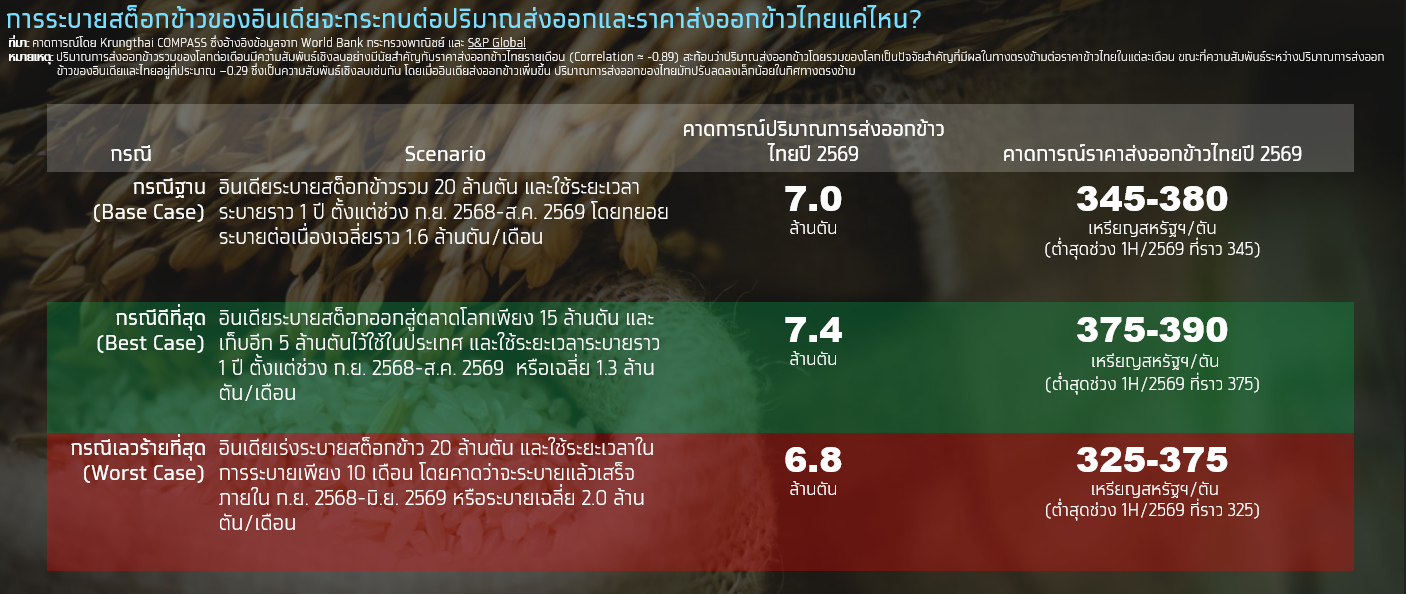 หากอินเดียระบายสต็อกข้าว 20 ล้านตัน ช่วง ก.ย.2568-ส.ค.2569 โดยทยอยระบายต่อเนื่องเฉลี่ย 1.6 ล้านตัน/เดือน (กรณี Base Case) ประเมินว่าปริมาณส่งออกข้าวไทยปี 2569 จะอยู่ที่ 7.0 ล้านตัน ลดลง -30% จากปี 2567 ส่วนราคาเฉลี่ยส่งออกข้าวขาวไทย 5% ในปี 2569 จะอยู่ที่ 345-380 เหรียญสหรัฐฯ/ตัน