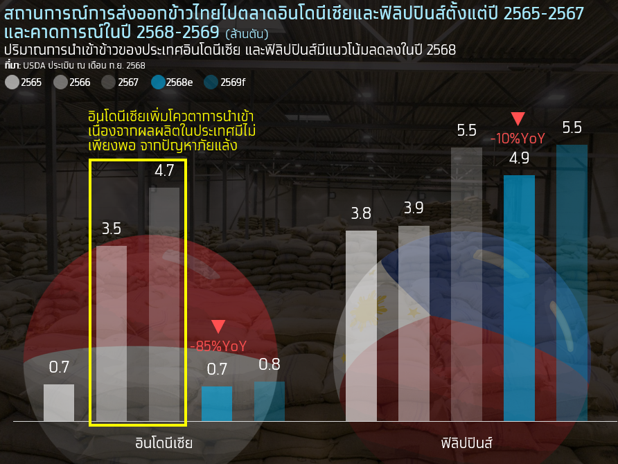 อินโดนีเซียเป็นหนึ่งในตลาดส่งออกข้าวที่สำคัญของไทย โดยในปี 2567 ไทยส่งออกข้าวไปอินโดนีเซียราว 1.3 ล้านตัน สูงเป็นลำดับที่ 1 ซึ่งเกิดจากในช่วงปี 2566-2567 อินโดนีเซียได้เพิ่มโควตาการนำเข้าข้าวเพื่อควบคุมราคาในประเทศที่ปรับตัวสูงขึ้น ทำให้ไทยได้รับอานิสงส์จากคำสั่งซื้อที่เพิ่มขึ้น อย่างไรก็ตาม ตั้งแต่ช่วงต้นปี 2568 รัฐบาลอินโดนีเซียมีการประกาศใช้มาตรการคุ้มครองผู้ผลิตในประเทศ ด้วยการจำกัดการนำเข้าข้าว เนื่องจากผลผลิตในอินโดนีเซียมีเพียงพอสำหรับการบริโภค ทำให้ตั้งแต่ช่วง ม.ค.-ส.ค. 2568 ปริมาณการส่งออกข้าวไทยไปตลาดอินโดนีเซียลดลงถึง 1.04 ล้านตัน (ลดลง -94%YoY) เช่นเดียวกับฟิลิปปินส์ซึ่งเป็นหนึ่งในตลาดส่งออกข้าวที่สำคัญของไทยลำดับที่ 6 ที่มีส่วนแบ่งตลาดราว 13% หรือ 6.5 แสนตัน ในปี 2567 ได้มีนโยบายห้ามนำเข้าข้าวเพื่อปกป้องเกษตรกรในประเทศตั้งแต่ช่วงปลายปี 2568 ถึงต้นปี 2569 ซึ่งจะส่งผลกระทบกับปริมาณการส่งออกข้าวโดยรวมของไทย