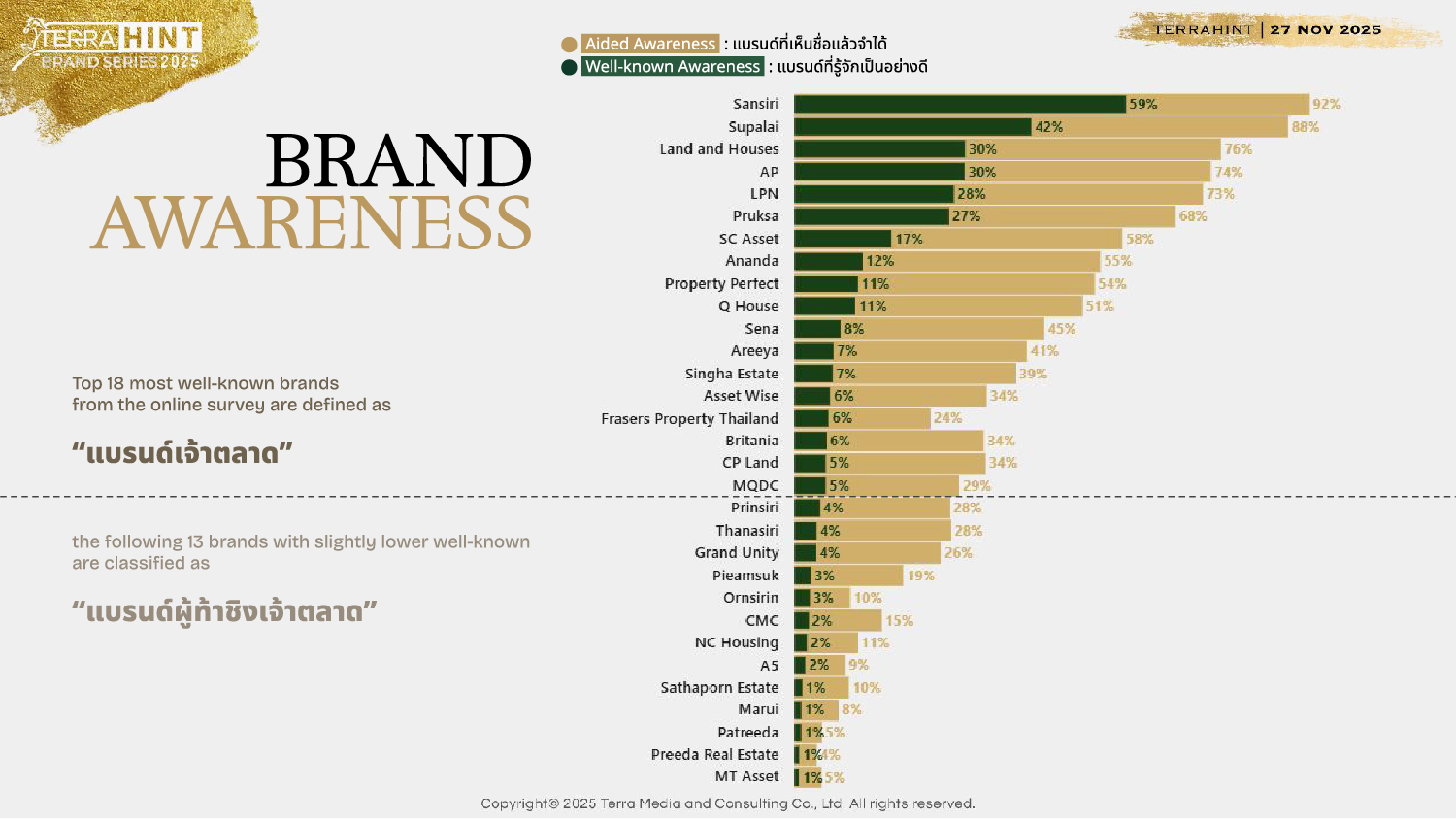 บริษัท แสนสิริ จำกัด (มหาชน) ตอกย้ำความเป็นผู้นำวงการอสังหาริมทรัพย์ไทย ด้วยการคว้า 2 รางวัล สูงสุดแห่งปีจากเวที Terra BKK เวทีสัมมนาด้านอสังหาริมทรัพย์ประจำปี “TerraHint Brand Series 2025 ภายใต้ธีม The Wellness Blueprint #อยู่ดีมีสูตร โดยแสนสิริคว้ารางวัลสูงสุดของเวทีปีนี้ “Hall of Fame” ที่สะท้อนถึงความสำเร็จในการสร้างแบรนด์ที่ทรงพลังในธุรกิจอสังหาริมทรัพย์ หรือ “The Most Powerful Real Estate Brand” ต่อเนื่องมาตลอด 7 ปี รวมทั้งในปีนี้ซึ่งครองแชมป์เป็นปีที่ 8 (2017 – 2025) โดดเด่นด้วยคะแนนยอดเยี่ยมใน 7 มิติสำคัญ ทั้งความหลากหลายของโครงการ คุณภาพที่เป็นที่ยอมรับ สร้างความแตกต่างในตลาด Brand Love และเป็นแบรนด์เป็นที่นิยมในไทย