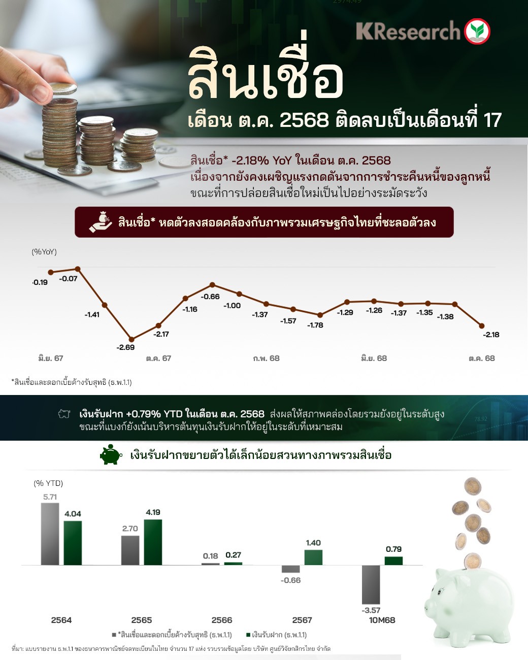 • ด้านเงินรับฝาก ณ สิ้นเดือนต.ค. 2568 อยู่ที่ระดับ 16.25 ล้านล้านบาท ขยายตัว 0.43% YoY ส่วนหนึ่งเป็นผลจากฐานเปรียบเทียบที่ค่อนข้างสูงในช่วงเดียวกันปีก่อน สำหรับการออกแคมเปญเงินฝากประจำพิเศษในเดือนต.ค. 2568 นั้น พบว่า จำนวนแคมเปญออกใหม่ดีดตัวขึ้นจากเดือนก่อนหน้า โดยแคมเปญออกใหม่ส่วนใหญ่ยังคงเป็นแคมเปญระยะสั้นและมีการปรับดอกเบี้ยเงินฝากให้สอดคล้องกับภาวะตลาด
