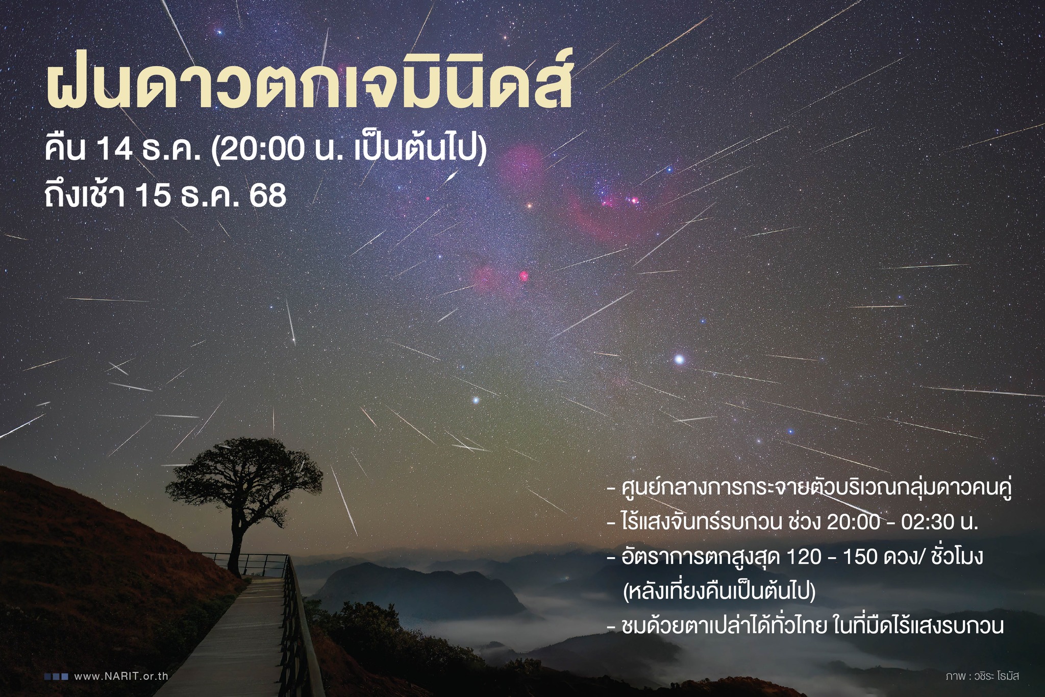 สถาบันวิจัยดาราศาสตร์แห่งชาติ (องค์การมหาชน) (สดร. หรือ NARIT) กระทรวงการอุดมศึกษา วิทยาศาสตร์ วิจัย และนวัตกรรม (อว.) เชิญชวนชาวไทยชม “ฝนดาวตกเจมินิดส์” คืน 14 - รุ่งเช้า 15 ธันวาคม 2568 เริ่มสังเกตได้ตั้งแต่เวลาประมาณ 20:00 น. จนถึง 02:30 น. (หลังจากนั้นจะมีแสงจันทร์รบกวน) คาดมีอัตราการตกเฉลี่ยสูงสุดประมาณ 120 - 150 ดวงต่อชั่วโมง ช่วงหลังเที่ยงคืนเป็นต้นไป ผู้สนใจชมได้ด้วย ตาเปล่าในพื้นที่โล่ง และมืดสนิท ปราศจากแสงรบกวน ดูได้ทุกภูมิภาคทั่วไทย