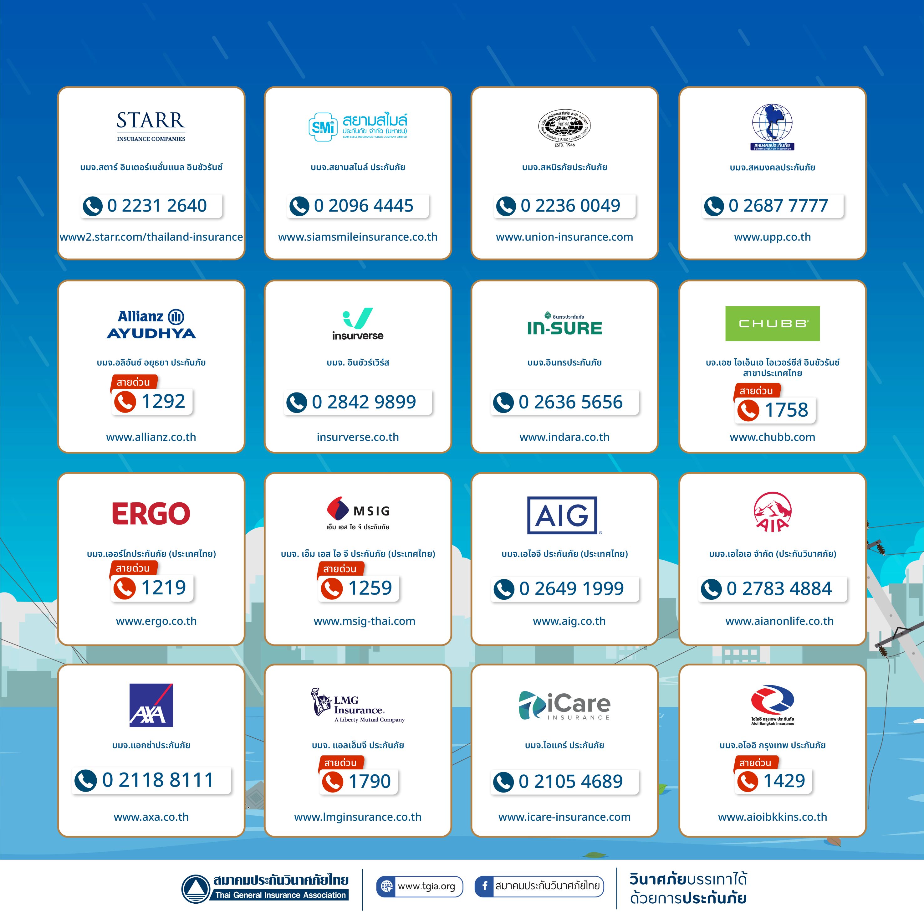 ดร. สมพร สืบถวิลกุล นายกสมาคมประกันวินาศภัยไทย กล่าวเพิ่มเติมว่า นอกจากนี้ เพื่อเป็นการดูแลและให้บริการผู้เอาประกันภัยที่ได้รับความเสียหาย สมาคมประกันวินาศภัยไทย ได้ตั้งศูนย์ประสานงานและอำนวยความสะดวกด้านประกันภัย เพื่อช่วยอำนวยความสะดวกในการเรียกร้องค่าสินไหมทดแทน การตรวจสอบข้อมูลในกรณีที่กรมธรรม์สูญหาย ตลอดจนการให้คำแนะนำเกี่ยวกับรายละเอียดความคุ้มครองผ่านช่องทางโทรศัพท์ 0 2108 8399 ในวันและเวลาทำการ และช่องทางออนไลน์ Facebook สมาคมประกันวินาศภัยไทย ตลอด 24 ชั่วโมง พร้อมทั้งเผยแพร่ประชาสัมพันธ์หมายเลขสายด่วนของทุกบริษัทประกันภัยให้ประชาชนรับทราบและติดต่อได้อย่างสะดวกรวดเร็ว รวมถึงประสานงานกับบริษัทสมาชิกให้เตรียมความพร้อมในการให้บริการช่วยเหลืออย่างเต็มที่ เร่งดำเนินการจ่ายค่าสินไหมทดแทน เพื่อบรรเทาความเดือดร้อนของผู้เอาประกันภัยโดยเร็วที่สุด