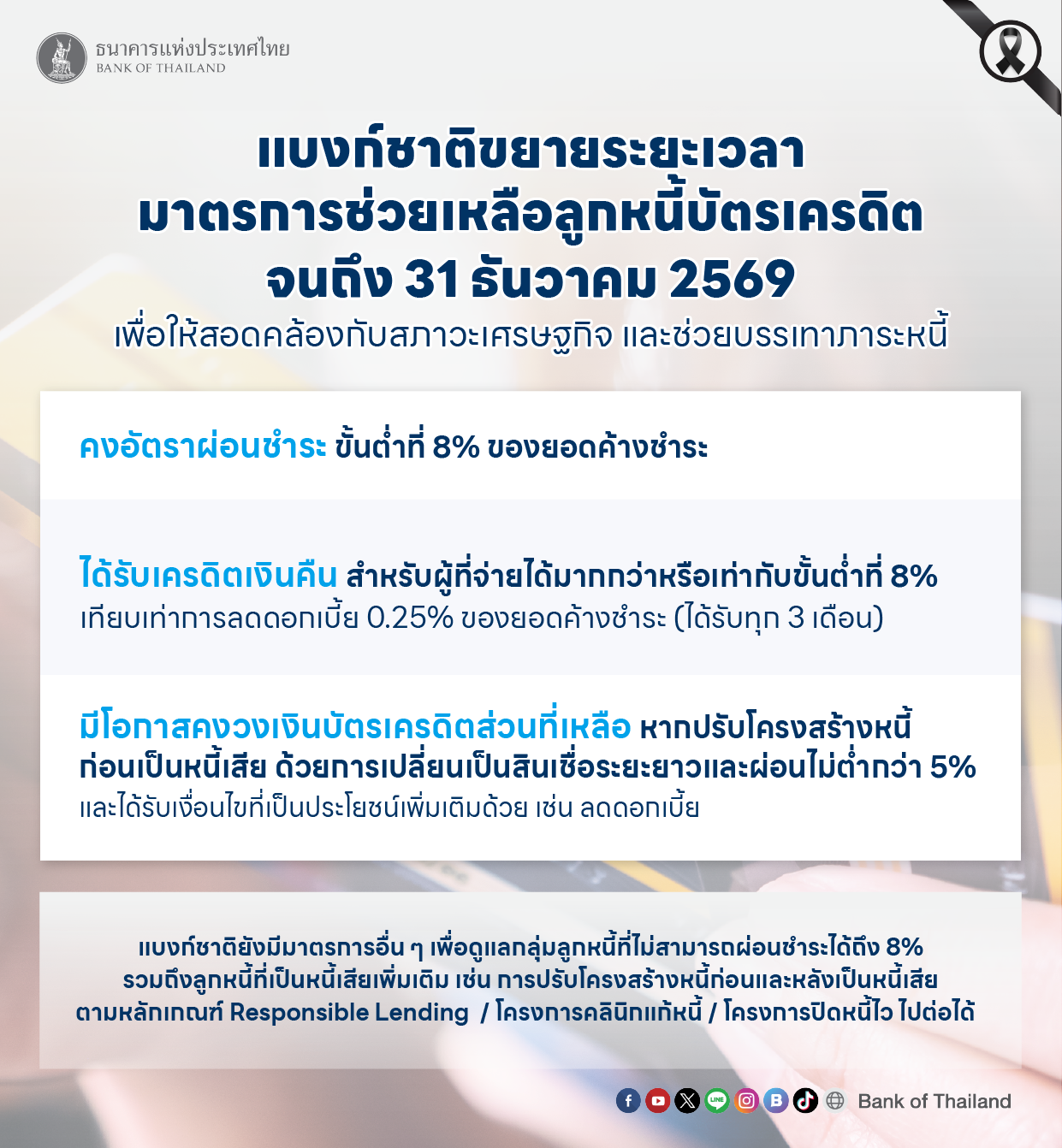 ในการนี้ ธปท. จึงเห็นควรขยายระยะเวลามาตรการช่วยเหลือลูกหนี้บัตรเครดิตออกไปจนถึงสิ้นปี 2569 จากเดิมที่จะมีผลสิ้นสุดในวันที่ 31 ธันวาคม 2568 โดยมีรายละเอียด ดังนี้