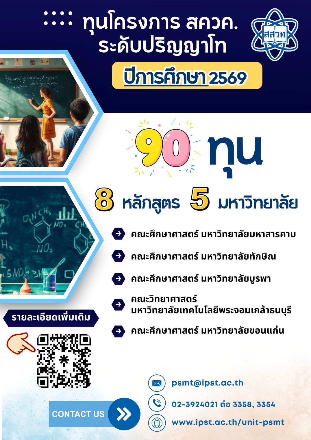 โดยดำเนินการคัดเลือกร่วมกับมหาวิทยาลัยชั้นนำ 5 แห่ง รวม 8 หลักสูตร เปิดรับสมัคร 2 รอบ โดยรอบที่ 1 เปิดรับสมัครตั้งแต่วันที่ 24 พฤศจิกายน 2568 ถึง วันที่ 8 มกราคม 2569 และ รอบที่ 2 เปิดรับสมัครวันที่ 17 กุมภาพันธ์ 2569 ถึง วันที่ 3 เมษายน 2569 อ่านรายละเอียดได้ที่ https://tr.ee/PuTtft สอบถามที่ฝ่าย สควค. โทร. 0 2392 4921 ต่อ 3358, 3354 และที่อีเมล psmt@ipst.ac.th