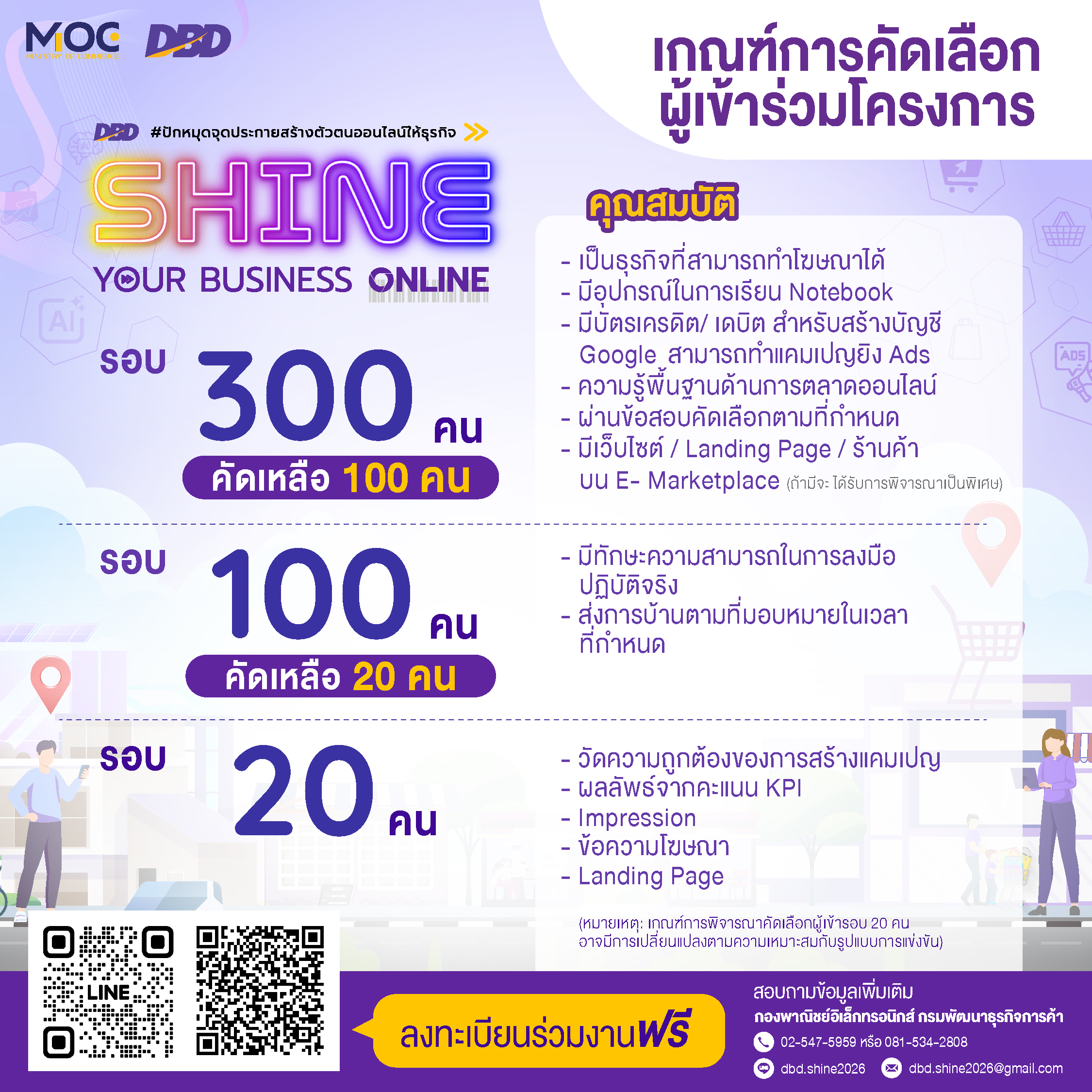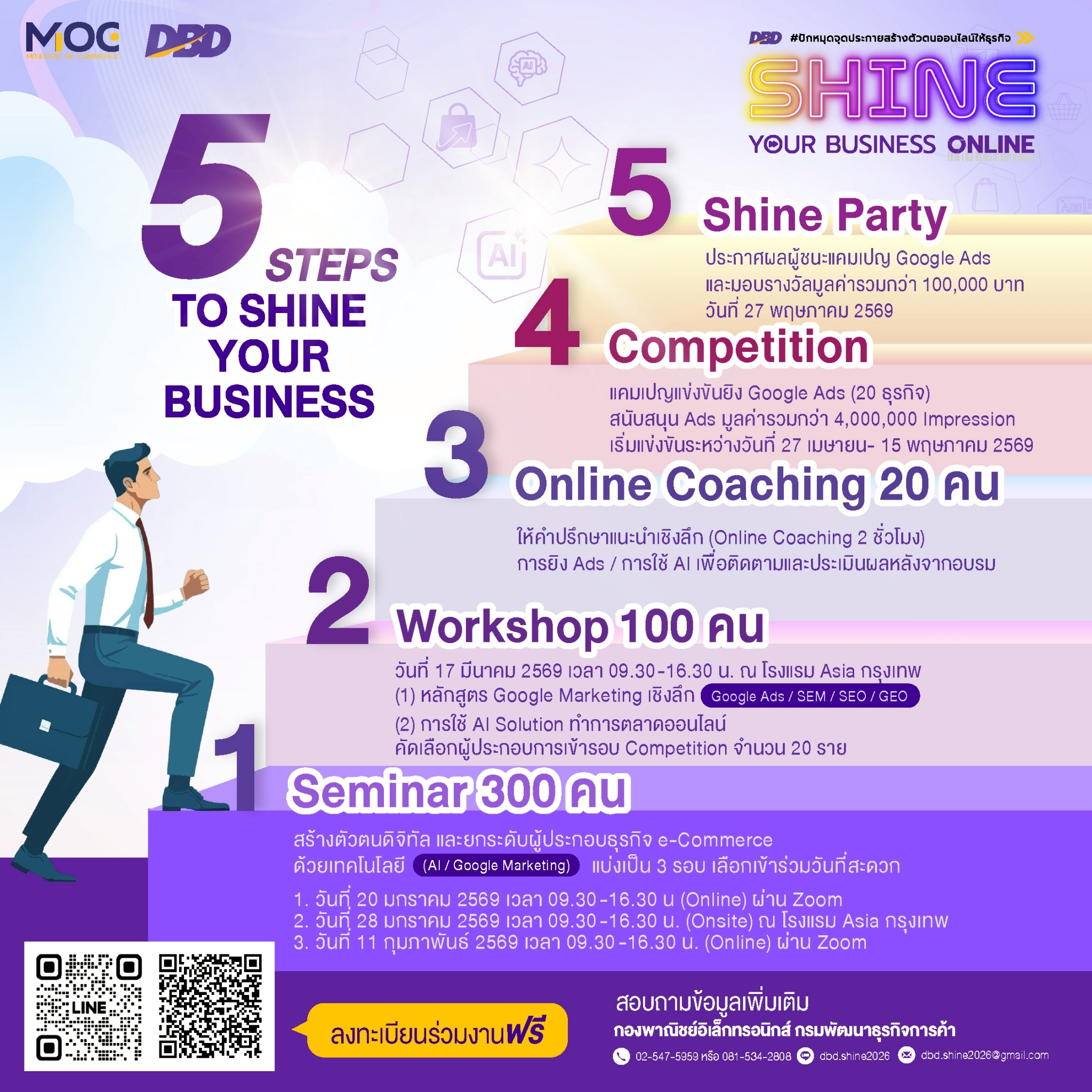 กรมพัฒนาธุรกิจการค้า เดินหน้าจัดกิจกรรม 'SHINE YOUR BUSINESS ONLINE #ปักหมุดจุดประกายสร้างตัวตนออนไลน์ให้ธุรกิจ' ปีที่ 2 (SHINE Season 2) เสริมทักษะเทคโนโลยี การตลาดออนไลน์แบบเข้มข้น ครบทั้งสัมมนา เวิร์กช็อป และโค้ชชิ่งเชิงลึก เพื่อปั้นผู้ประกอบการไทยสู่แนวหน้า พร้อมสร้างตัวตนบนโลกออนไลน์ด้วย Google Platform ตลอดจนเสริมการใช้ AI เป็นเครื่องมือเพิ่มประสิทธิภาพการตลาดธุรกิจดิจิทัล สมัครได้แล้วตั้งแต่วันนี้-31 มกราคม 2569 หรือจนกว่าที่นั่งจะเต็ม