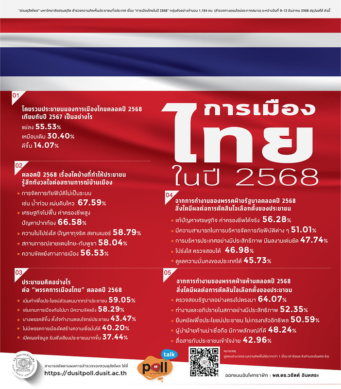 “สวนดุสิตโพล” มหาวิทยาลัยสวนดุสิต สำรวจความคิดเห็นประชาชนทั่วประเทศ เรื่อง “การเมืองไทยในปี 2568” กลุ่มตัวอย่างจำนวน 1,194 คน (สำรวจทางออนไลน์และภาคสนาม) ระหว่างวันที่ 9-12 ธันวาคม 2568 พบว่า กลุ่มตัวอย่างมองภาพรวมการเมืองไทยตลอดปี 2568 แย่ลง ร้อยละ 55.53 โดยเรื่องที่ทำให้รู้สึกกังวลใจต่อสถานการณ์บ้านเมือง คือ การจัดการภัยพิบัติที่ไม่เป็นระบบ เช่น น้ำท่วมและแผ่นดินไหว ร้อยละ 67.59 เมื่อพิจารณาความเห็นต่อพรรคการเมืองไทย พบว่า กลุ่มตัวอย่างมองว่าพรรคการเมืองยังเน้นทำเพื่อประโยชน์ส่วนตนมากกว่าประชาชน ร้อยละ 59.05 จากการทำงานของพรรคฝ่ายรัฐบาลตลอดปี 2568 สิ่งที่มีผลต่อการตัดสินใจเลือกตั้งของประชาชน คือ การแก้ปัญหาเศรษฐกิจและค่าครองชีพได้จริง ร้อยละ 56.28 ส่วนของพรรคฝ่ายค้าน คือ การตรวจสอบรัฐบาลอย่างตรงไปตรงมา ร้อยละ 64.07