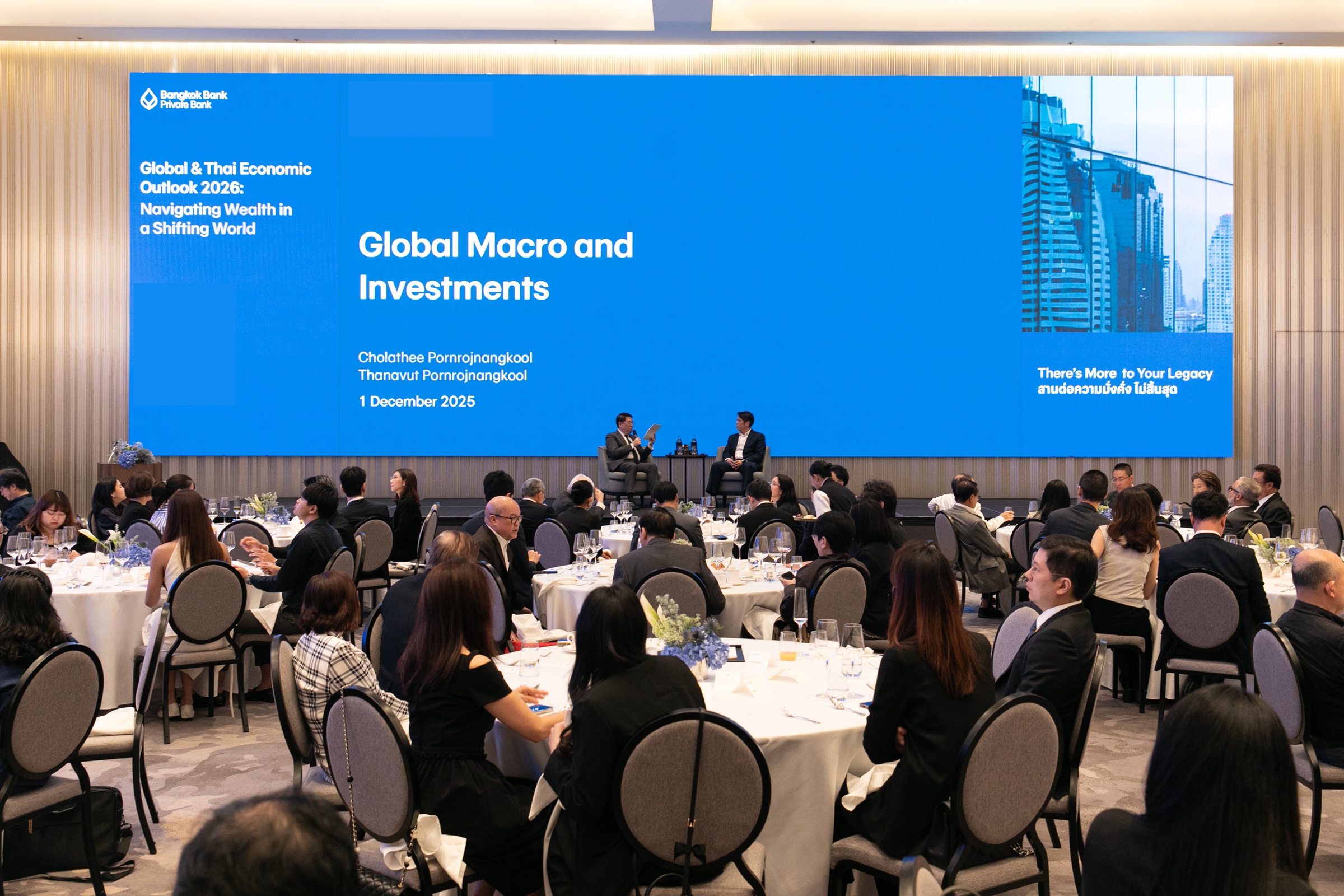 เพื่อนคู่คิดสนับสนุนความมั่งคั่ง - ธนาคารกรุงเทพ จำกัด (มหาชน) นำโดย นายกอบศักดิ์ ภูตระกูล กรรมการรองผู้จัดการใหญ่ นางสาววรพร วิทยะสิรินันท์ ผู้ช่วยผู้จัดการใหญ่ บริหารกลุ่มลูกค้า Wealth & Private Bank นายคล็อด แฮบเบร่อร์ที่ปรึกษาบริหารกลุ่มลูกค้า Wealth & Private Bank นายชลธี พรโรจนางกูร เจ้าหน้าที่บริหารระดับ Senior Vice President บริหารกลุ่มลูกค้า Wealth & Private Bank พร้อมด้วยผู้เชี่ยวชาญด้านเศรษฐกิจและการลงทุน นายดง เฉิน (Mr. Dong Chen), Chief Asia Strategist at Pictet Wealth Management และ ดร.ธนาวุฒิ พรโรจนางกูร Co-Chief Investment Officer กองทุนบัวหลวง ร่วมแบ่งปันความรู้ทิศทางเศรษฐกิจโลก วิเคราะห์ความเสี่ยง และเปิดมุมมองโอกาสใหม่สำหรับกลุ่มลูกค้าผู้มีความมั่งคั่ง ในงานสัมมนาพิเศษ Global & Thai Economic Outlook 2026: Navigating Wealth in a Shifting World สำหรับลูกค้า Bangkok Bank Private Bank จำนวน 100 ราย เพื่อถ่ายทอดมุมมองเศรษฐกิจและทิศทางการลงทุนท่ามกลางความเปลี่ยนแปลงของโลกในช่วงปลายปี 2568 และเตรียมความพร้อมสำหรับโอกาสการลงทุนใหม่ในปี 2569
