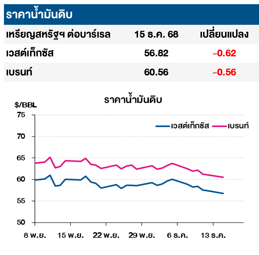 (-) ความคืบหน้าในการเจรจาสันติภาพเพื่อยุติสงครามในยูเครนเป็นปัจจัยที่ส่งผลให้ราคาน้ำมันปรับลดในวันจันทร์ที่ผ่านมาโดยล่าสุดประธานาธิบดี โวโลดีเมียร์ เซเลนสกี ผู้นำยูเครน ประกาศว่ายูเครนพร้อมละทิ้งความหวังในการเข้าร่วมองค์การสนธิสัญญาป้องกันแอตแลนติกเหนือ (นาโต) หากสามารถแลกกับการได้รับหลักประกันด้านความมั่นคงภายใต้ข้อตกลงสันติภาพเพื่อยุติสงครามกับรัสเซียที่ดำเนินมาเกือบ 4 ปี ทั้งนี้ หากการเจรจาสันติภาพประสบความสำเร็จ จะมีการยกเลิกมาตรการคว่ำบาตรต่อรัสเซีย ซึ่งจะส่งผลให้รัสเซียสามารถส่งออกน้ำมันสู่ตลาดโลก