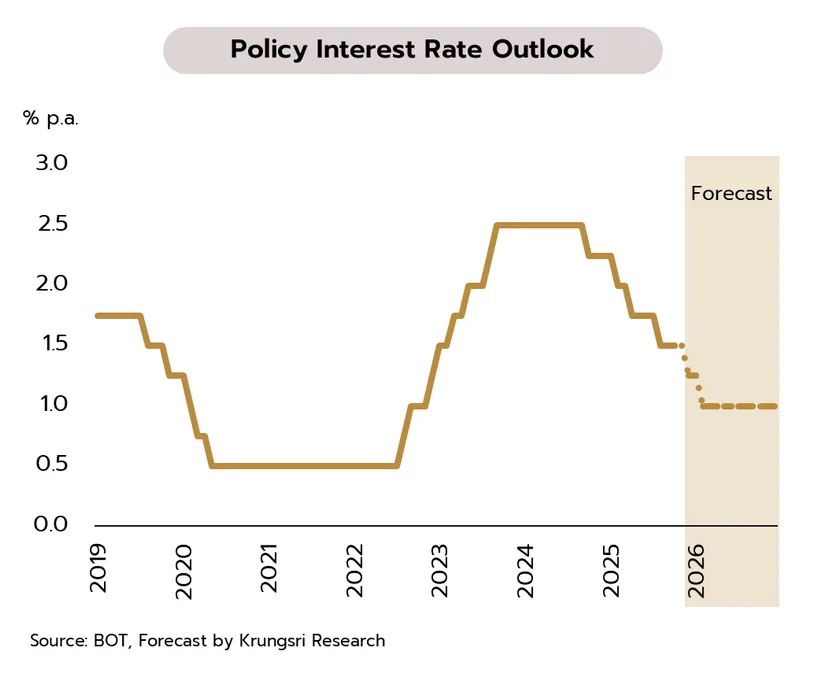 คาดกนง.ปรับลดดอกเบี้ยนโยบายสู่ 1.25% ในการประชุมครั้งสุดท้ายของปีนี้ ท่ามกลางแรงกดดันเศรษฐกิจและการเมือง การประชุมคณะกรรมการนโยบายการเงิน (กนง.) ในกลางสัปดาห์นี้ วันที่ 17 ธันวาคม วิจัยกรุงศรีประเมิน กนง.มีแนวโน้มปรับลดอัตราดอกเบี้ยนโยบายลงสู่ระดับ 1.25% ซึ่งจะเป็นการปรับลดเป็นครั้งที่ 4 ในปีนี้ เนื่องจาก (i) เพื่อรองรับเศรษฐกิจที่ชะลอตัวชัดเจน หลังจาก GDP ในไตรมาส 3 หดตัวเป็นครั้งแรกในรอบเกือบ 3 ปี (–0.6% QoQ sa) สะท้อนการสูญเสียแรงส่งทางเศรษฐกิจ ขณะที่ในช่วงไตรมาสสุดท้ายของปีแม้มีสัญญาณฟื้นตัวโดยได้แรงหนุนระยะสั้นจากมาตรการกระตุ้นของรัฐ อาทิ โครงการคนละครึ่งพลัส และเที่ยวดีมีคืน แต่ผลบวกดังกล่าวถูกลดทอนไปบางส่วนจากผลกระทบของอุทกภัยในภาคใต้ (ii) แรงกดดันด้านเงินเฟ้อที่อยู่ในระดับต่ำ จากแนวโน้มอัตราเงินเฟ้อทั่วไปเฉลี่ยทั้งปี 2568 ติดลบเล็กน้อยราว -0.2% และคาดว่าจะยังอยู่ต่ำกว่ากรอบเป้าหมาย (1–3%) ตลอดปี 2569 (iii) ด้านเสถียรภาพทางการเงิน ภาคธุรกิจและครัวเรือนยังเผชิญภาระหนี้สูง รวมถึงสินเชื่อภาคเอกชนหดตัวต่อเนื่อง และ (iv) ล่าสุดปัจจัยทางการเมือง สถานะของรัฐบาลรักษาการซึ่งอาจกระทบการเบิกจ่ายงบประมาณและการลงทุนภาครัฐโครงการใหม่ มีแนวโน้มลดทอนแรงส่งเศรษฐกิจตั้งแต่ปลายปี 2568 ภายใต้ข้อจำกัดของนโยบายการคลังดังกล่าว นโยบายการเงินจึงอาจเป็นเครื่องมือที่มีบทบาทสำคัญในฐานะ Counter-cyclical policy เพื่อประคองเศรษฐกิจไทยในช่วงเปลี่ยนผ่าน ดังนั้น จึงมีโอกาสสูงขึ้นที่กนง.จะปรับลดอัตราดอกเบี้ยนโนบายเพิ่มเติมจากปัจจุบันที่ 1.50% ลงสู่ระดับ 1.00% ภายในช่วงครึ่งแรกของปี 2569