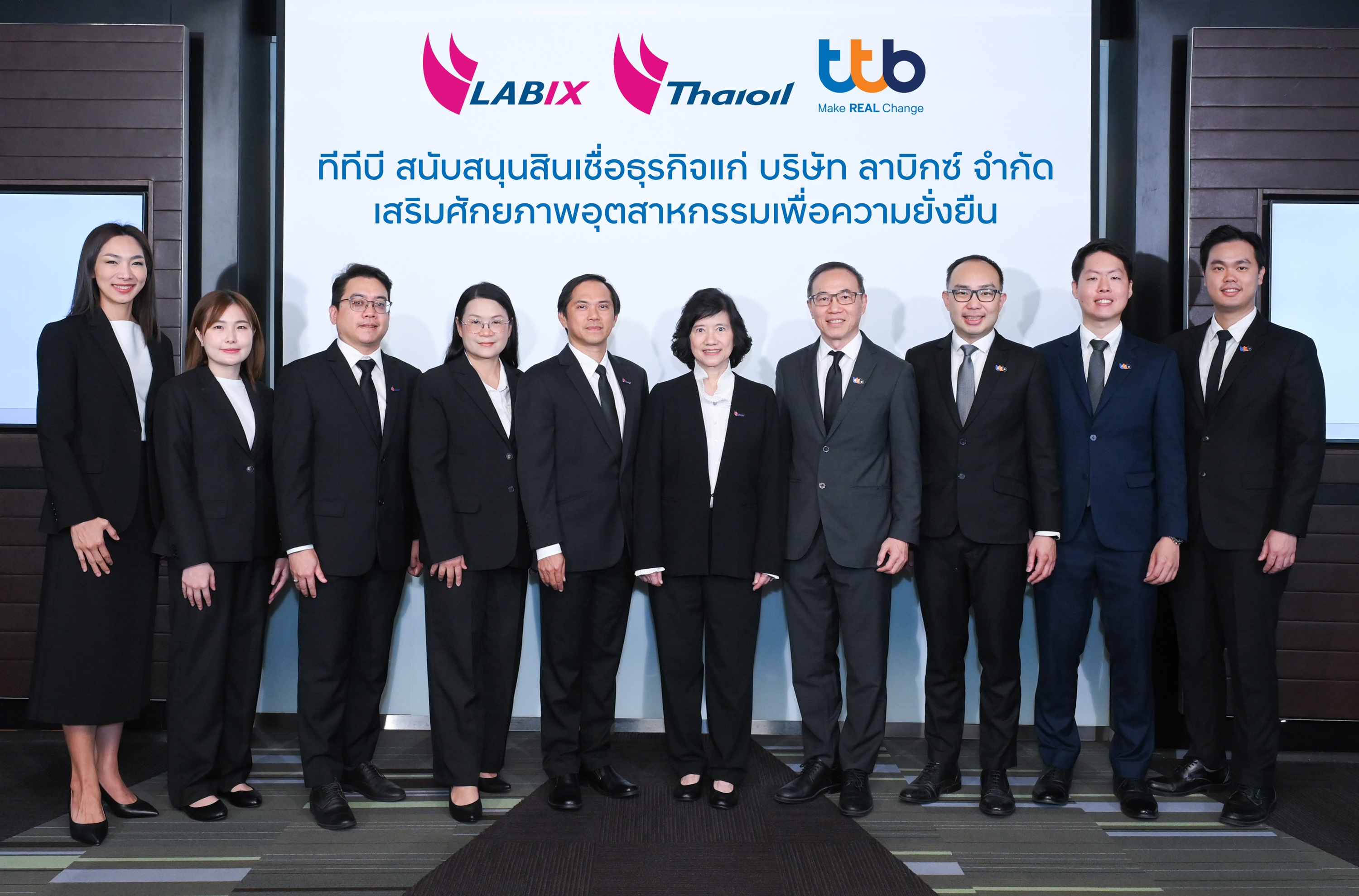 ทีทีบีตอกย้ำการเป็นพันธมิตรทางธุรกิจที่พร้อมเคียงข้างและสนับสนุนลูกค้าองค์กรขนาดใหญ่ โดยเฉพาะกลุ่มที่ดำเนินธุรกิจด้วยนวัตกรรมและคำนึงถึงความยั่งยืน นำโดยนายวิสูจน์ ตั้งอดุลย์รัตน์ (ที่ 4 จากขวา) ประธานกลุ่ม บริหารความสัมพันธ์ธุรกิจ ทีเอ็มบีธนชาต ให้การสนับสนุนสินเชื่อธุรกิจ แก่ บริษัท ลาบิกซ์ จำกัด ซึ่งเป็นบริษัทย่อยของ บริษัท ไทยออยล์ จำกัด (มหาชน) นำโดยนางวนิดา บุญภิรักษ์ (ที่ 5 จากขวา) รองกรรมการผู้จัดการใหญ่ ด้านการเงินและบัญชี บริษัท ไทยออยล์ จำกัด (มหาชน) และนายเชษฐ์ โปร่งจิตต์ (ที่ 6 จากขวา) กรรมการอำนวยการ บริษัท ลาบิกซ์ จำกัด รวมวงเงินสินเชื่อทั้งสิ้น 2,800 ล้านบาท
