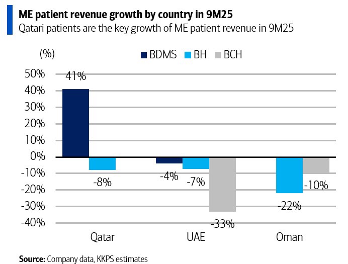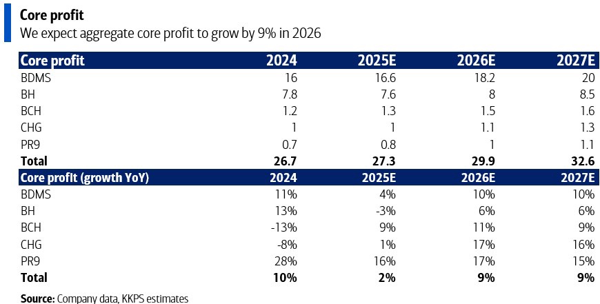 สำหรับผู้ป่วยต่างชาติ KKPS มองว่ามีโอกาสฟื้นตัวแรงกว่า เนื่องจากหลายปัจจัยเป็นเพียงเหตุการณ์ชั่วคราว ได้แก่ จำนวนผู้ป่วยจากคูเวตที่ลดลงในช่วงมกราคม-กุมภาพันธ์ เหตุแผ่นดินไหวในไทยในเดือนมีนาคม และจำนวนผู้ป่วยจากกัมพูชาที่ชะลอตั้งแต่ปลายเดือนพฤษภาคม ทั้งนี้ KKPS ยังเห็นการเติบโตระดับตัวเลขกลางหลักเดียวในผู้ป่วยตะวันออกกลาง แม้หักผลกระทบจากคูเวต ขณะที่ผู้ป่วยยุโรปยังโตแบบตัวเลขสองหลัก ดังนั้น KKPS จึงคาดว่าผู้ป่วยต่างชาติจะเติบโตได้ราว 8% ในปี 2026 โดยรวมแล้ว KKPS มองว่ากำไรภาคโรงพยาบาลคาดว่าจะฟื้นจาก 2% ในปี 2025 เป็น 9% ในปี 2026