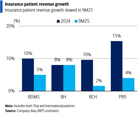 เนื่องจากหุ้นภาคโรงพยาบาลปรับตัวต่ำกว่าดัชนีตลาดหลักทรัพย์แห่งประเทศไทยราว 17% ตั้งแต่ต้นปี บริษัทหลักทรัพย์ เกียรตินาคินภัทร จำกัด (มหาชน) (KKPS) จึงมองว่าความกังวลเรื่องการเติบโตชะลอในปี 2025 ถูกประเมินเกินจริง เนื่องจากหลายปัญหาเป็นเพียงปัญหาชั่วคราว โดยเฉพาะกรณีผู้ป่วยต่างชาติที่ลดลง โดยเมื่อรวมกับปริมาณผู้ป่วยในประเทศที่ลดลงเช่นเดียวกัน รายได้จากผู้ป่วยต่างชาติและผู้ป่วยในประเทศจึงคาดว่าจะโตเพียง 2% และ 3% ในปีนี้ตามลำดับ KKPS มองว่าการเติบโตของผู้ป่วยในประเทศอาจเป็นประเด็นเชิงโครงสร้าง เพราะอัตราเติบโตอาจเหลือเพียงระดับตัวเลขกลางหลักเดียวในอนาคต สอดคล้องกับผู้ป่วยประกันที่ชะลอจากตัวเลขสองหลักเหลือเพียงระดับตัวเลขกลางหลักเดียวในปี 2025 จากผลของมาตรการร่วมจ่าย (co-payment) นอกจากนี้ การชะลอตัวของเศรษฐกิจโดยรวมก็เป็นส่วนหนึ่งที่ทำให้จำนวนผู้ป่วยในประเทศลดลง KKPS คาดว่าการเติบโตของผู้ป่วยในประเทศจะกลับสู่ภาวะปกติที่ 4% ในปี 2026