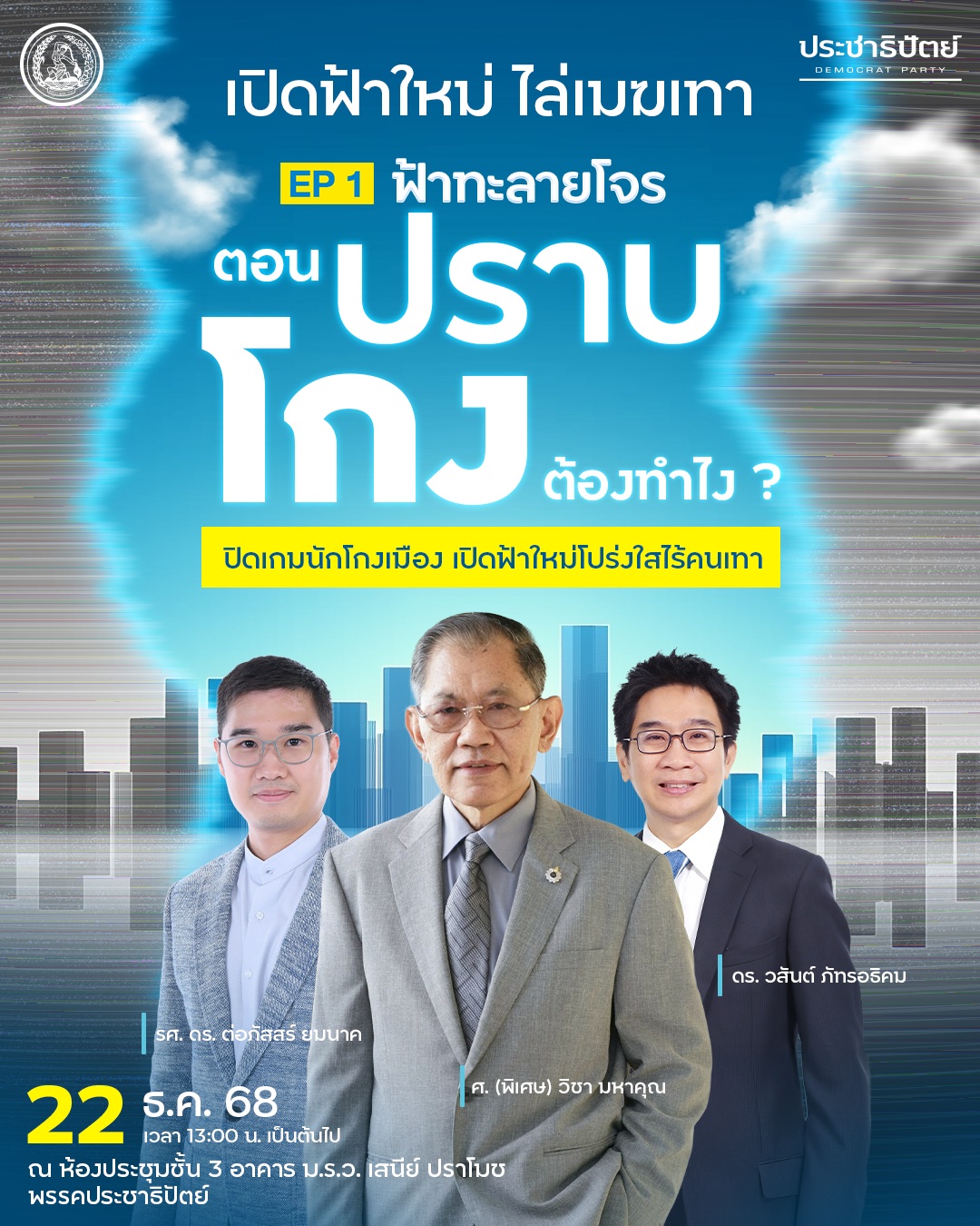 พรรคประชาธิปัตย์ เตรียมเปิดเวทีเสวนาทางวิชาการและการเมือง ภายใต้หัวข้อ "เปิดฟ้าใหม่ ไล่เมฆเทา EP.1 ฟ้าทะลายโจร ตอน ปราบโกง ต้องทำไง ?" เพื่อจุดประกายการแลกเปลี่ยนความคิดเรื่องการต่อต้านคอร์รัปชัน และบทบาทพรรคการเมืองในการฟื้นฟูความเชื่อมั่นของประชาชนต่อระบบการเมืองไทย