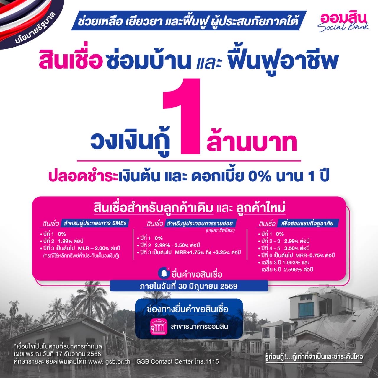 2. สินเชื่อเพื่อฟื้นฟูผู้ประสบอุทกภัยภาคใต้ สำหรับลูกค้าเดิมและลูกค้าใหม่ เพื่อซ่อมแซมที่อยู่อาศัย หรือฟื้นฟูการประกอบอาชีพ วงเงินกู้สูงสุดรายละไม่เกิน 1 ล้านบาท ยื่นกู้ภายในวันที่ 30 มิถุนายน 2569 แบ่งตามประเภทสินเชื่อ ได้แก่