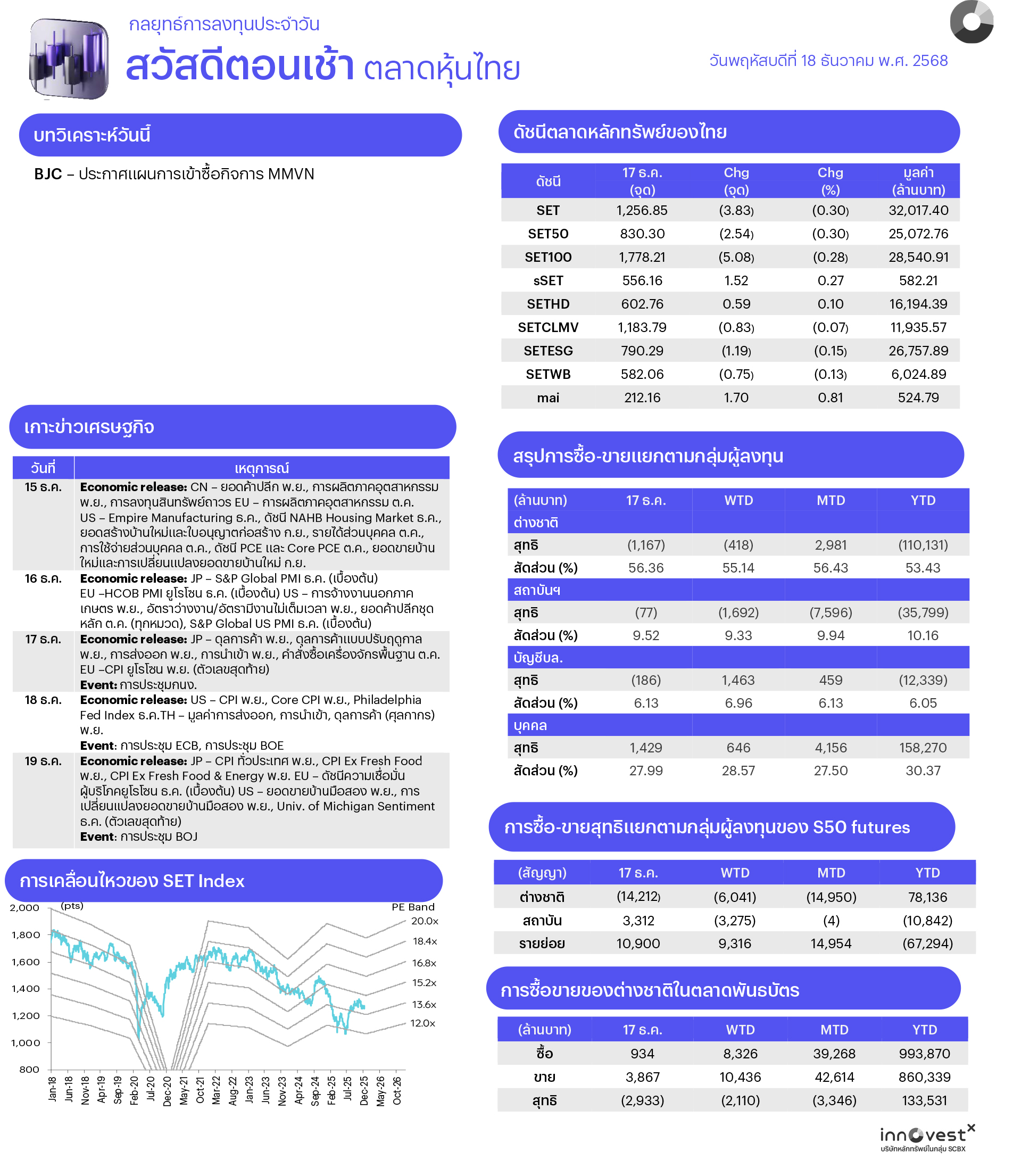 • วันนี้ติดตามการประชุม BoE (ตลาดคาดลดดอกเบี้ยลงสู่ 3.75%) และ ECB (ตลาดคาดคงดอกเบี้ยที่ 2.00%) จากวานนี้มีการรายงานภาวะเงินเฟ้อใน พ.ย. 2568 ของสหราชอาณาจักรและยูโรโซนที่ชะลอลงและต่ำกว่าที่ตลาดคาด +3.2%YoY และ +2.1%YoY ตามลำดับ