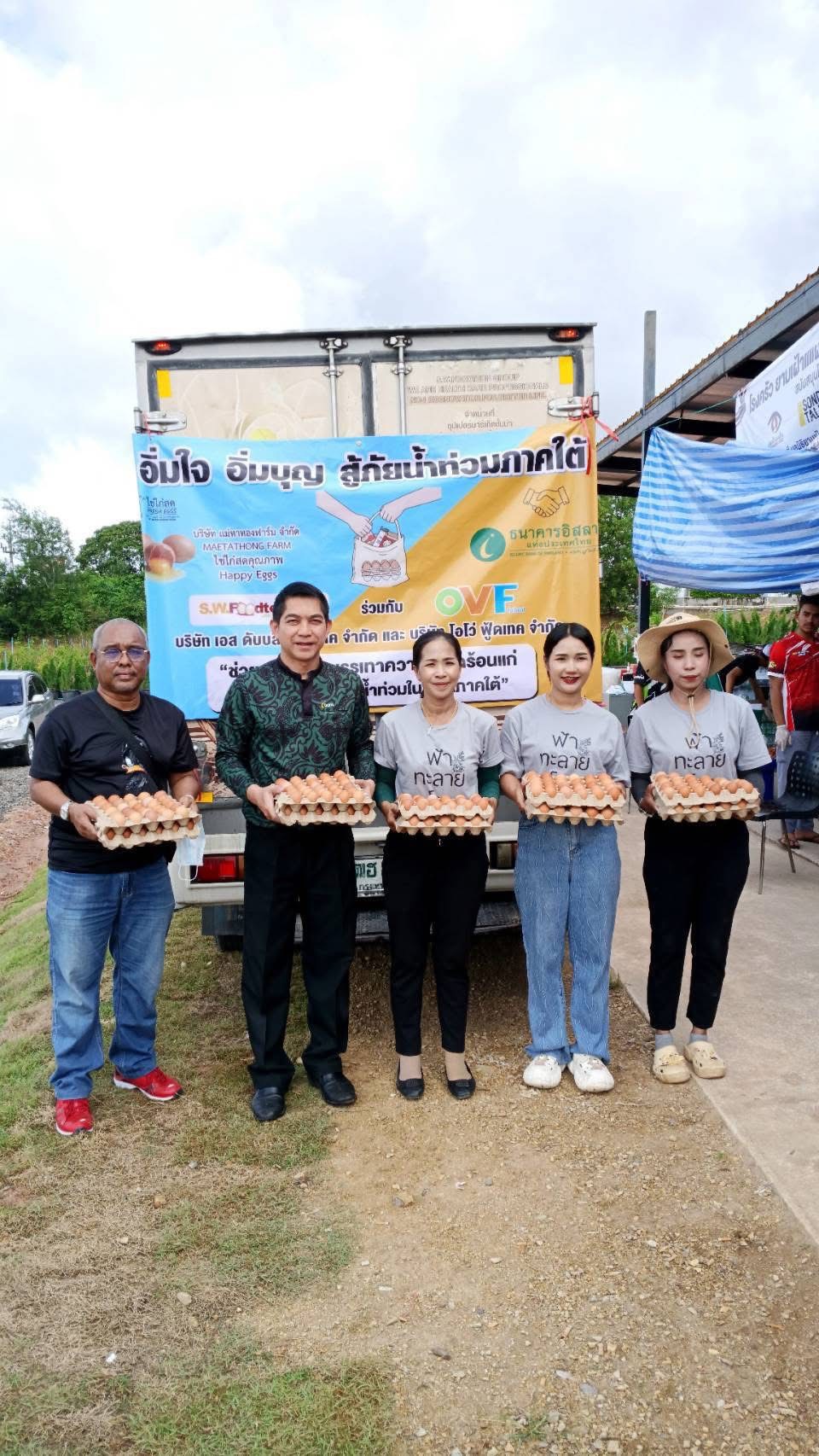 ทั้งนี้ น.สพ. รัชชานนท์ เรืองใจ และสพ.ญ.รัชนีกร คุปติเวช ผู้บริหาร บริษัท แม่ทาทองฟาร์ม จำกัด ผู้จำหน่ายไข่ไก่สด ภายใต้ Brand “Happy Egg” นายสุรพล เค้าภูไทย ผู้บริหาร บริษัท เอส.ดับบลิว.ฟู้ดเทค จำกัด และบริษัท โอโว่ ฟู้ดเทค จำกัด และว่าที่ร้อยตรี สุวรรณี ข้องแก้ว กรรมการผู้จัดการ บริษัท แคปปิตอล ฟู้ด อินเตอร์เนชั่นแนล จำกัด ยังคงให้การสนับสนุนอาหารสดอย่างต่อเนื่อง ผ่านเครือข่ายพันธมิตรของธนาคารอิสลามแห่งประเทศไทย ได้แก่ สภาเครือข่ายช่วยเหลือด้านมนุษยธรรม สำนักจุฬาราชมนตรี และมูลนิธิยามเฝ้าแผ่นดิน ประกอบด้วย รายการไข่สด 30,000 ฟอง จำนวน 1,000 ถาด ไข่ต้มปอกเปลือก 23,000 ฟอง จำนวน 230 ถัง และไข่รวมเหลวพาสเจอร์ไรซ์ 180 กิโลกรัม จำนวน 36 แกลลอน และปลากระป๋อง จำนวน 750 กระป๋อง ลงพื้นที่แจกจ่ายให้ความช่วยเหลือในอำเภอหาดใหญ่ และอำเภอสะเดา จังหวัดสงขลา โดยมีผู้แทนลูกค้าธนาคารอิสลามแห่งประเทศไทย ส่งมอบให้กับนายอิสม่าแอน หมัดอะด้ำ รองประธานสภาเครือข่ายช่วยเหลือด้านมนุษยธรรม สำนักจุฬาราชมนตรี และ อาจารย์ พทป.แวสะมิง แวหมะ (หมอแวร์) และทีมงานคุณอิ๊ คุณณัฐวุฒิ เป็นผู้รับผิดชอบโรงครัวฮาลาล ณัฐชาณาฮิลล์ (Halal) ในนามมูลนิธิยามเฝ้าแผ่นดิน ณ โรงแรมณัฐชาณา ฮิลล์ ถนนสนามบิน-ลพบุรีราเมศวร์ ตำบลควนลัง อำเภอหาดใหญ่ จังหวัดสงขลา