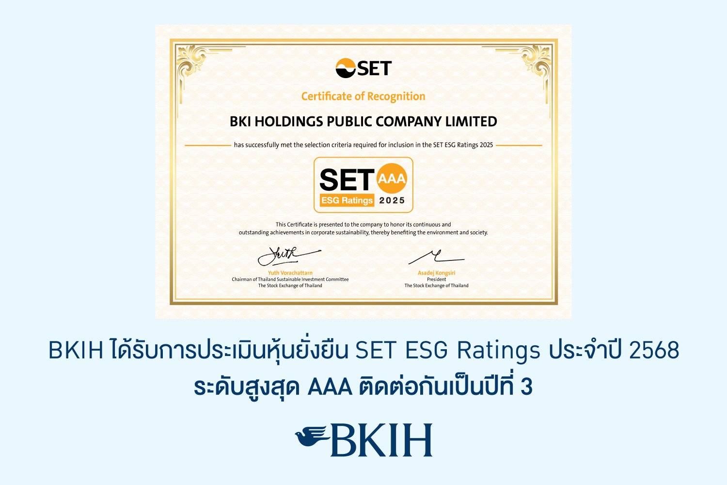 บริษัท บีเคไอ โฮลดิ้งส์ จำกัด (มหาชน) หรือ BKIH ได้รับผลการประเมินอยู่ในรายชื่อหุ้นยั่งยืนของตลาดหลักทรัพย์แห่งประเทศไทย (SET ESG Ratings) ประจำปี 2568 ในระดับ AAA ซึ่งเป็นระดับสูงสุดติดต่อกัน 3 ปีต่อเนื่อง ตั้งแต่ปี 2566 - 2568 อีกทั้งยังได้รับผลคะแนนรวมสูงกว่าค่าเฉลี่ยในกลุ่มอุตสาหกรรมธุรกิจการเงิน โดยการประเมินในภาพรวมการดำเนินงานของบริษัทฯ ตามกระบวนการขับเคลื่อนองค์กรสู่ความยั่งยืนในมิติสิ่งแวดล้อม สังคม และบรรษัทภิบาล (Environmental, Social and Governance หรือ ESG) รวมถึงมีคุณสมบัติของบริษัทจดทะเบียนตามที่ตลาดหลักทรัพย์ฯ กำหนด โดยผลการดำเนินงานด้าน ESG ของบีเคไอ โฮลดิ้งส์มีความโดดเด่นในการดำเนินธุรกิจที่ให้ความสำคัญกับความรับผิดชอบต่อสิ่งแวดล้อม สังคม ภายใต้การกำกับดูแลกิจการที่ดี รวมถึงมีการบริหารจัดการความเสี่ยงอย่างเหมาะสม ใช้กลยุทธ์ในการดำเนินงานอย่างสร้างสรรค์ โดยคำนึงถึงผลกระทบทั้งเชิงบวกและเชิงลบที่มีต่อผู้มีส่วนได้เสียทุกกลุ่มทั้งผู้ถือหุ้น ลูกค้า คู่ค้า พนักงาน หน่วยงานกำกับดูแล ตลอดจนสังคมและชุมชน เพื่อยืนหยัดการเติบโตทางธุรกิจอย่างมั่นคงและแข็งแกร่ง พร้อมยกระดับมาตรฐานองค์กรสู่ความยั่งยืนในระยะยาว