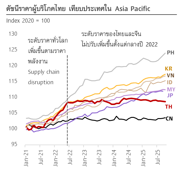 อัตราเงินเฟ้อที่ต่ำมากนี้อาจกดดันการทำกำไรของภาคธุรกิจที่ไม่สามารถปรับราคาสินค้าและบริการเพิ่มได้ ซึ่งจะส่งผลมายังรายได้ของครัวเรือนที่เติบโตได้ต่ำ นอกจากนี้ อาจทำให้ครัวเรือนเผชิญกับภาวะ “Debt deflation” ผ่านภาระหนี้ครัวเรือนที่ลดลงช้า เนื่องจากอัตราเงินเฟ้อไม่ได้อยู่ในระดับเหมาะสมที่จะช่วยลดภาระหนี้ครัวเรือนในรูปมูลค่าที่แท้จริงได้ ทั้งหมดนี้จะเป็นกลไกที่ลดทอนกำลังซื้อของภาคครัวเรือน และอาจเพิ่มความเสี่ยงที่เศรษฐกิจไทยจะเข้าสู่ภาวะเงินฝืด (Deflation)