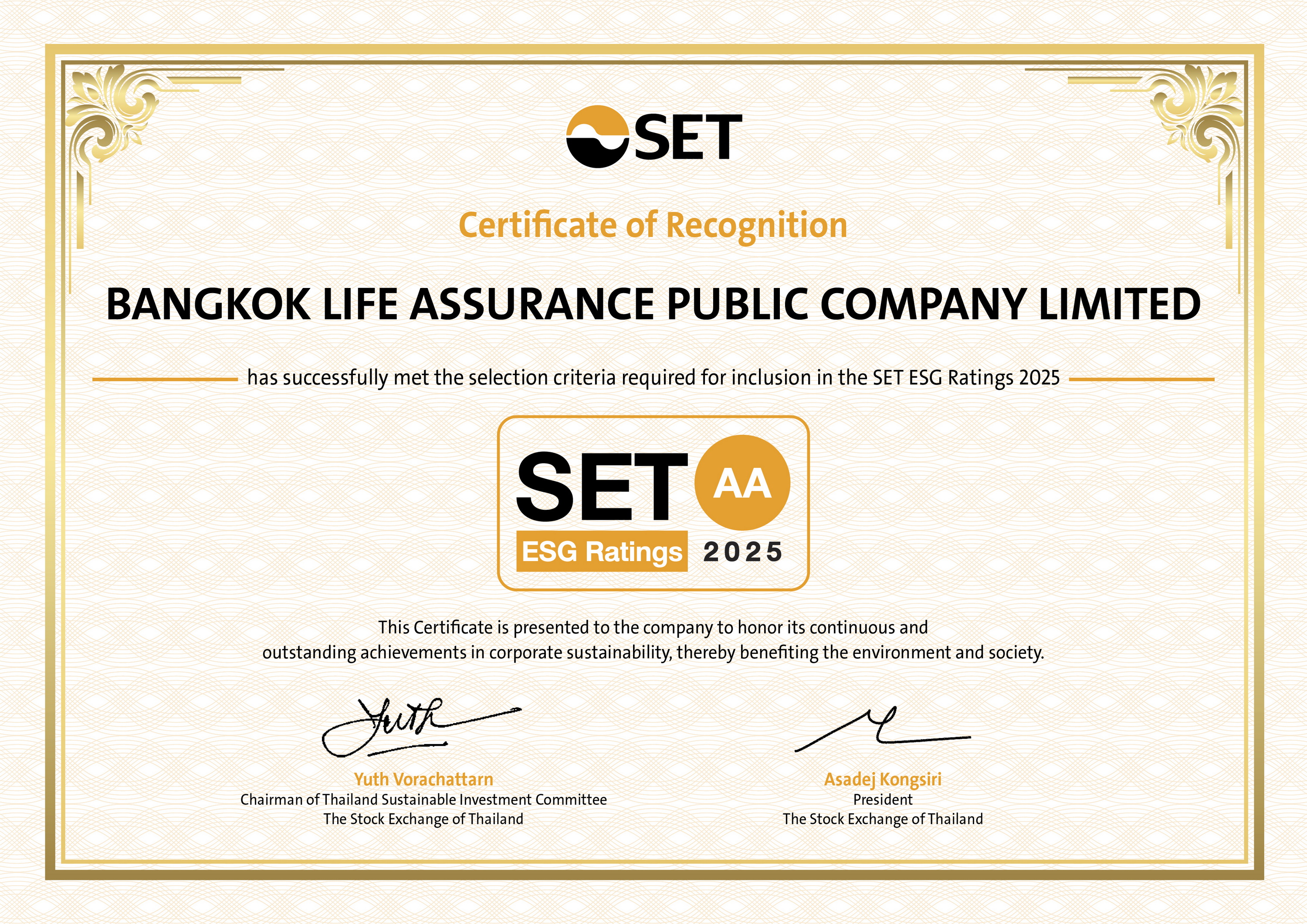 บริษัท กรุงเทพประกันชีวิต จำกัด (มหาชน) ได้รับคัดเลือกให้อยู่ในรายชื่อหุ้นยั่งยืน "SET ESG Ratings" ต่อเนื่องเป็นปีที่ 5 โดยในปี 2568 ได้รับผลการประเมินในระดับ AA จากตลาดหลักทรัพย์แห่งประเทศไทย โดยเป็นหนึ่งในบริษัทจดทะเบียน 265 แห่ง ที่ได้รับการประกาศผลประเมินหุ้นยั่งยืน SET ESG Ratings รวมถึงยังได้รับผลการประเมินจากการสำรวจการกำกับดูแลกิจการบริษัทจดทะเบียนไทย (Corporate Governance Report of Thai Listed Companies - CGR) ปี 2568 ในระดับ 5 ดาว หรือ “ดีเลิศ” (Excellent CG Scoring) ต่อเนื่องเป็นปีที่ 3 จากการประเมินของสมาคมส่งเสริมสถาบันกรรมการบริษัทไทย สะท้อนถึงความมุ่งมั่นของกรุงเทพประกันชีวิตที่ให้ความสำคัญกับการ “ใส่ใจ” และ “เข้าใจ” ในความต้องการของผู้มีส่วนได้เสียทุกกลุ่ม การดำเนินธุรกิจตามหลักธรรมาภิบาลที่ดี โปร่งใส มีความรับผิดชอบต่อผู้มีส่วนได้เสียทุกภาคส่วน รวมถึงการบริหารจัดการองค์กรอย่างมีประสิทธิภาพและยั่งยืน โดยกรุงเทพประกันชีวิตยังคงยึดมั่นในการพัฒนาและยกระดับการกำกับดูแลกิจการให้สอดคล้องกับมาตรฐานสากล เพื่อสร้างความเชื่อมั่นแก่ผู้ถือหุ้น ลูกค้า คู่ค้า และสังคม พร้อมขับเคลื่อนองค์กรสู่การเติบโตอย่างมั่นคงและยั่งยืนในระยะยาว