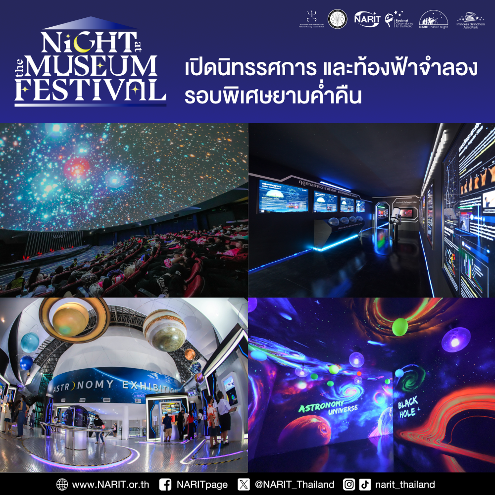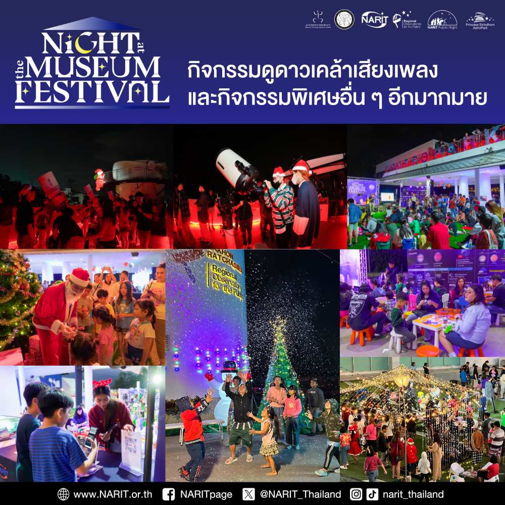 สถาบันวิจัยดาราศาสตร์แห่งชาติ (องค์การมหาชน) (สดร. หรือ NARIT) กระทรวงการอุดมศึกษา วิทยาศาสตร์ วิจัยและนวัตกรรม (อว.) ชวนเที่ยวนิทรรศการดาราศาสตร์ ท้องฟ้าจำลองรอบพิเศษยามค่ำคืน พร้อมกิจกรรมมากมายส่งท้ายเทศกาลคริสต์มาส และเพลิดเพลินกับการชมดาวเคล้าเสียงเพลง ใน "NARIT Night at the Museum 2025" วันที่ 27 - 28 ธันวาคม 2568 เวลา 10:00 - 22:00 น. ณ อุทยานดาราศาสตร์สิรินธร อ. แม่ริม จ. เชียงใหม่ และหอดูดาวภูมิภาคสำหรับประชาชนทั้ง 4 แห่ง ที่นครราชสีมา ขอนแก่น ฉะเชิงเทรา และสงขลา