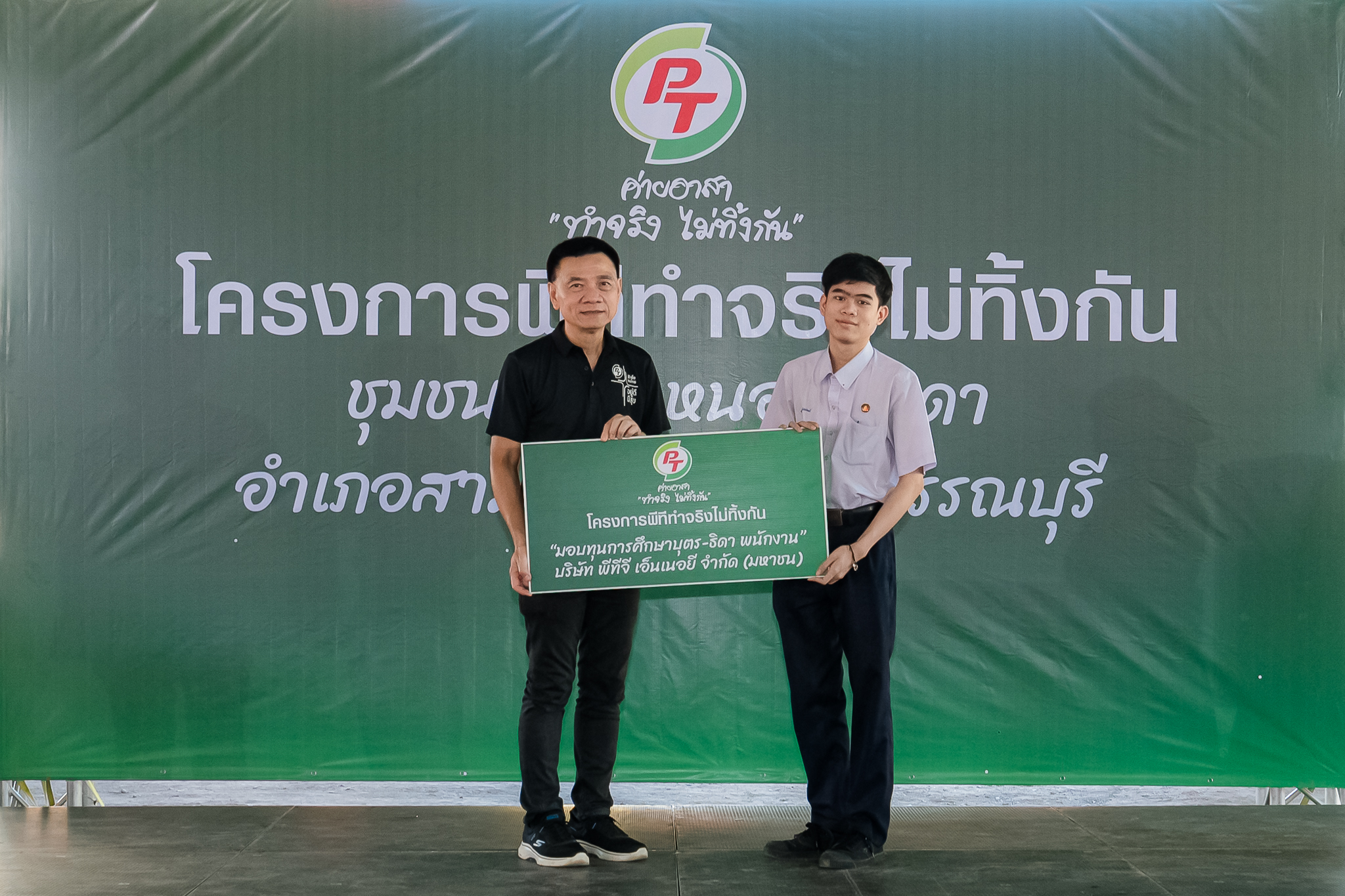 2. ด้านการศึกษาและเยาวชน: มอบทุนการศึกษาสำหรับนักเรียนเรียนดีแต่ขาดแคลนทุนทรัพย์ ที่อยู่ในพื้นที่ชุมชนนี้ ทั้ง 6 สถานศึกษา จำนวน 42 ทุน ทุนละ 2,000 บาท พร้อมมอบทุนการ ศึกษาบุตรและธิดาของพนักงานเรียนดี แต่ขาดแคลนทุนทรัพย์ อีกจำนวน 10 ทุน ทุนละ 2,000 บาท รวมถึงสนับสนุนอุปกรณ์การเรียน อุปกรณ์กีฬา มอบพันธุ์ผักสวนครัวสำหรับประกอบอาหารกลางวัน และปรับปรุงสนามเปตอง นอกจากนี้ยังมีการจัดประกวดวาดภาพระบายสีหัวข้อ “ชุมชนรุ่นใหม่ ก้าวไกลไปกับ พีที” เพื่อเปิดพื้นที่ความคิดสร้างสรรค์ให้กับเยาวชน และยังมีกิจกรรมเสริมทักษะจากกลุ่มอาสาสมัคร Gen Z มหาวิทยาลัยราชภัฏวไลยอลงกรณ์ ในพระบรมราชูปถัมภ์ มาร่วมกิจกรรม “PT พี่อาสา สอนน้องเรียน พาน้องเล่น PT Gen Z English Fun” และมหาวิทยาลัยสวนดุสิต วิทยาเขตสุพรรณบุรี มาร่วมสร้างสีสัน กับกิจกรรม PT Gen Z Music Concert