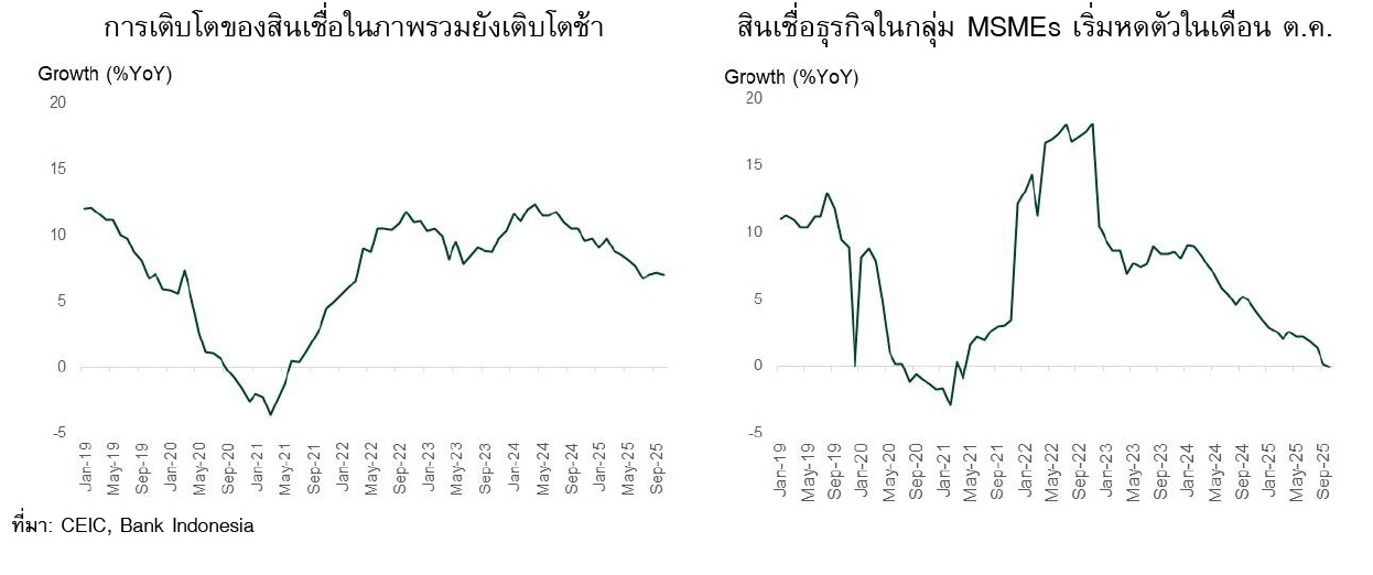 · การฟื้นตัวของสินเชื่อยังช้าต่ำกว่าเป้าหมายของ BI ที่ 8-11% ในปีนี้ โดยสินเชื่อรวมใน ต.ค. ขยายตัวช้าลงต่อเนื่องเหลือ 6.96%YoY จากที่ขยายตัว 8.97%YoY ในเดือน ม.ค. ขณะที่สินเชื่อธุรกิจขนาดไมโคร ขนาดกลางและขนาดเล็ก (Micro, Small and Medium Enterprises: MSMEs) ซึ่งมีสัดส่วน 18% ของสินเชื่อทั้งระบบหดตัวเล็กที่ -0.1%YoY สะท้อนว่ากิจกรรมทางเศรษฐกิจยังต้องการแรงสนับสนุนเพิ่มเติม (รูปที่ 2)