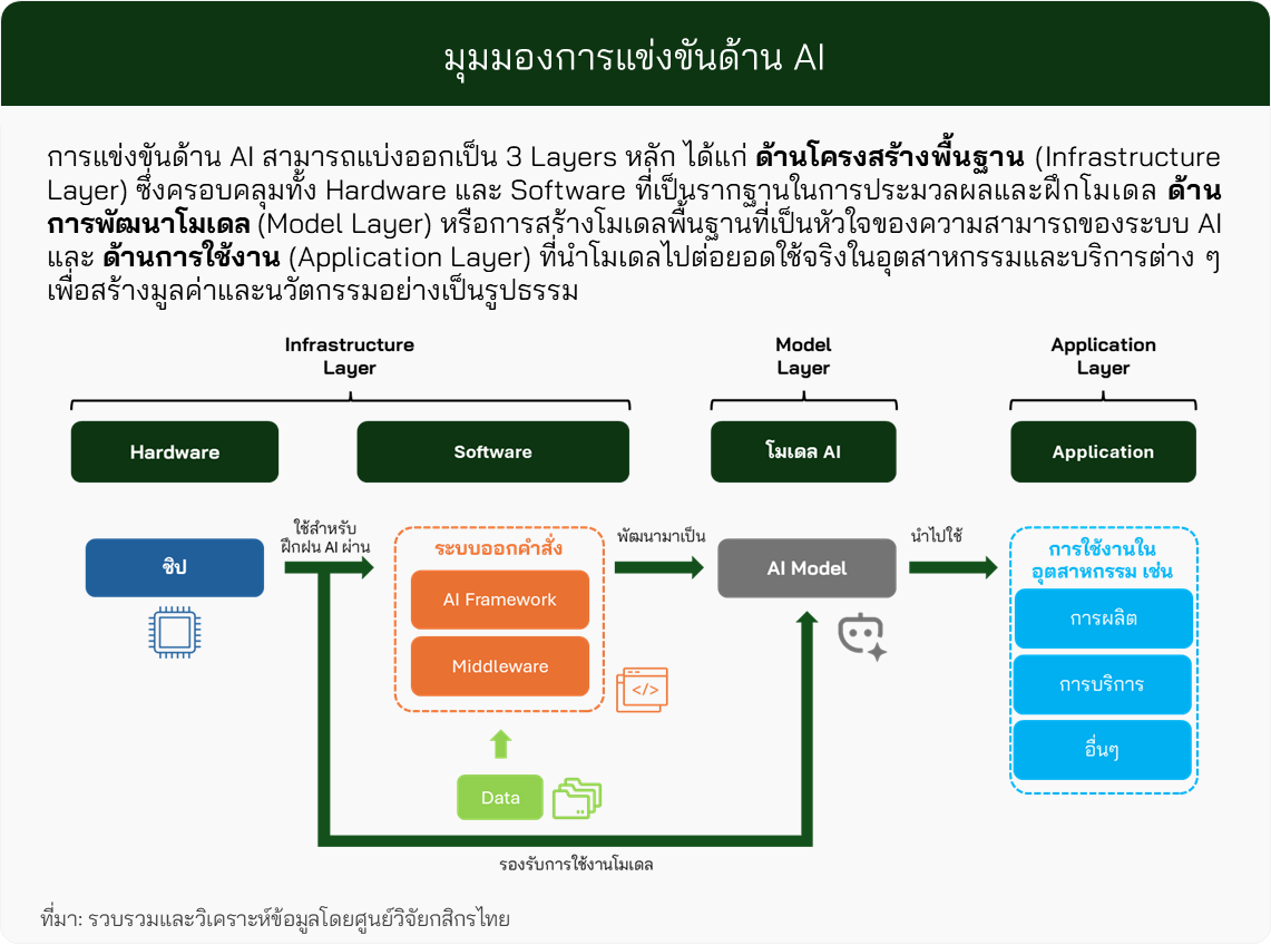 ดังนั้น สำหรับโครงสร้างพื้นฐาน (Infrastructure) ทั้งในส่วนของชิปประมวลผลขั้นสูง (Hardware) และ ระบบสำหรับพัฒนาโมเดล (Software) สหรัฐฯ ยังครองความได้เปรียบเชิงเทคโนโลยีในอุตสาหกรรม AI อย่างชัดเจน